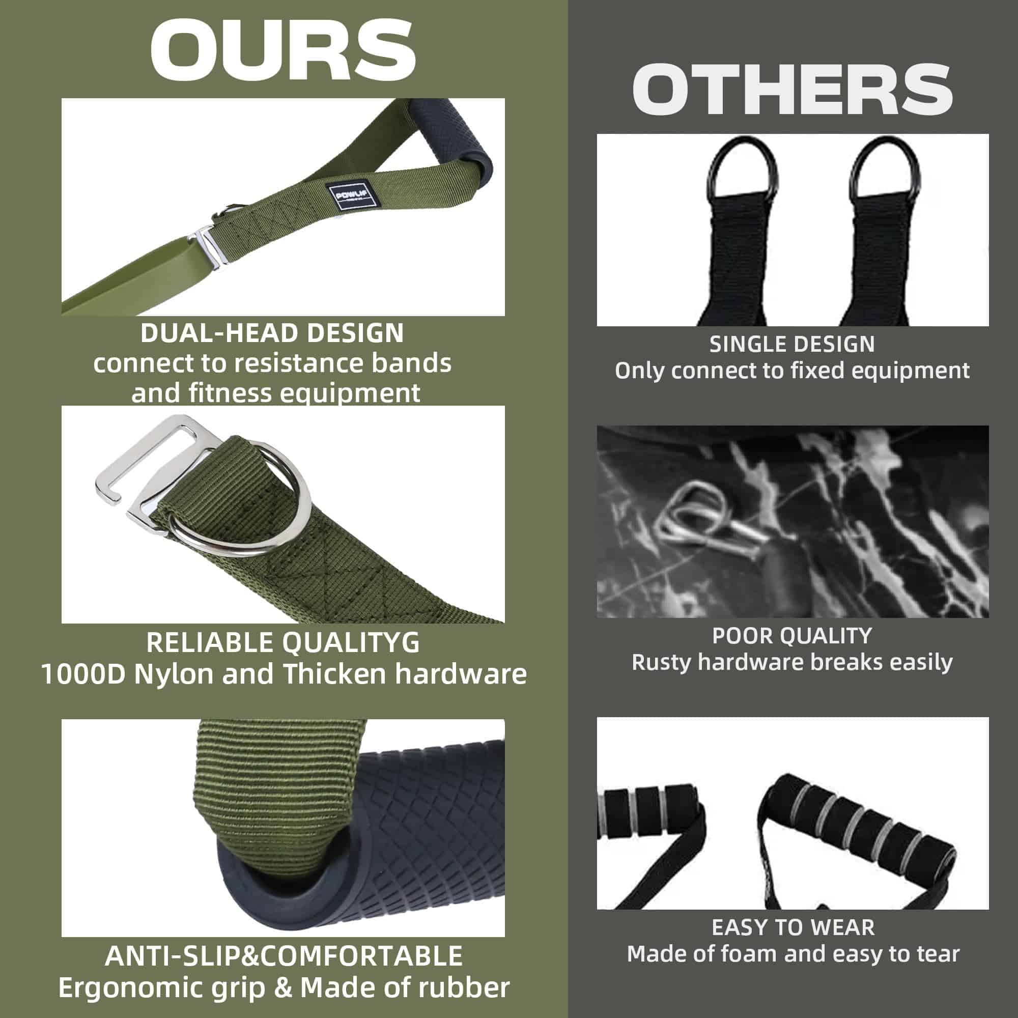 POWLIF Resistance Bands Handles, Mangos de Ejercicio Multiuso para Bandas de ResistenciaNuestros mangos de bandas de resistencia POWLIF son la opción perfecta para llevar tus entrenamientos al siguiente nivel. Diseñados con un exclusivo diseño de doble cabeza con dos puntos de conexión, estos mangos de ejercicio te ofrecen una versatilidad incomparable en cualquier rutina de fitness. Con un extremo en forma de conector G diseñado para bandas de látex anchas y el otro extremo con un anillo en D estándar engrosado, puedes estar seguro de que estos mangos se adaptarán a tus diversas necesidades de entrenamiento. Construidos con mosquetones de metal grandes y correas de nylon duraderas, estos mangos están diseñados para soportar incluso los entrenamientos más intensos. Los agarres texturizados proporcionan una superficie antideslizante y una durabilidad superior a las alternativas de espuma más económicas. El diseño texturizado asegura un rendimiento antideslizante excepcional, permitiéndote usarlos con confianza en cualquier condición, ya sea húmedo o sudoroso. Ya sea que estés haciendo remo, jalando hacia abajo, press de pecho o utilizandolos con bandas de resistencia, estos mangos de ejercicio ofrecen un soporte y estabilidad ideales para una amplia variedad de ejercicios. Ya sea que tu objetivo sea desarrollar fuerza muscular, mejorar la condición física o participar en entrenamientos de cuerpo completo, estos mangos de ejercicio destacan por su versatilidad para ayudarte a alcanzar tus objetivos de fitness. Ligeros y portátiles, los mangos de accesorios de máquina de cable de POWLIF son fáciles de transportar y llevar contigo a cualquier lugar. Con su diseño compacto, puedes guardarlos fácilmente en tu bolsa de gimnasio para poder realizar entrenamientos efectivos en casa, en el gimnasio o incluso durante tus viajes.