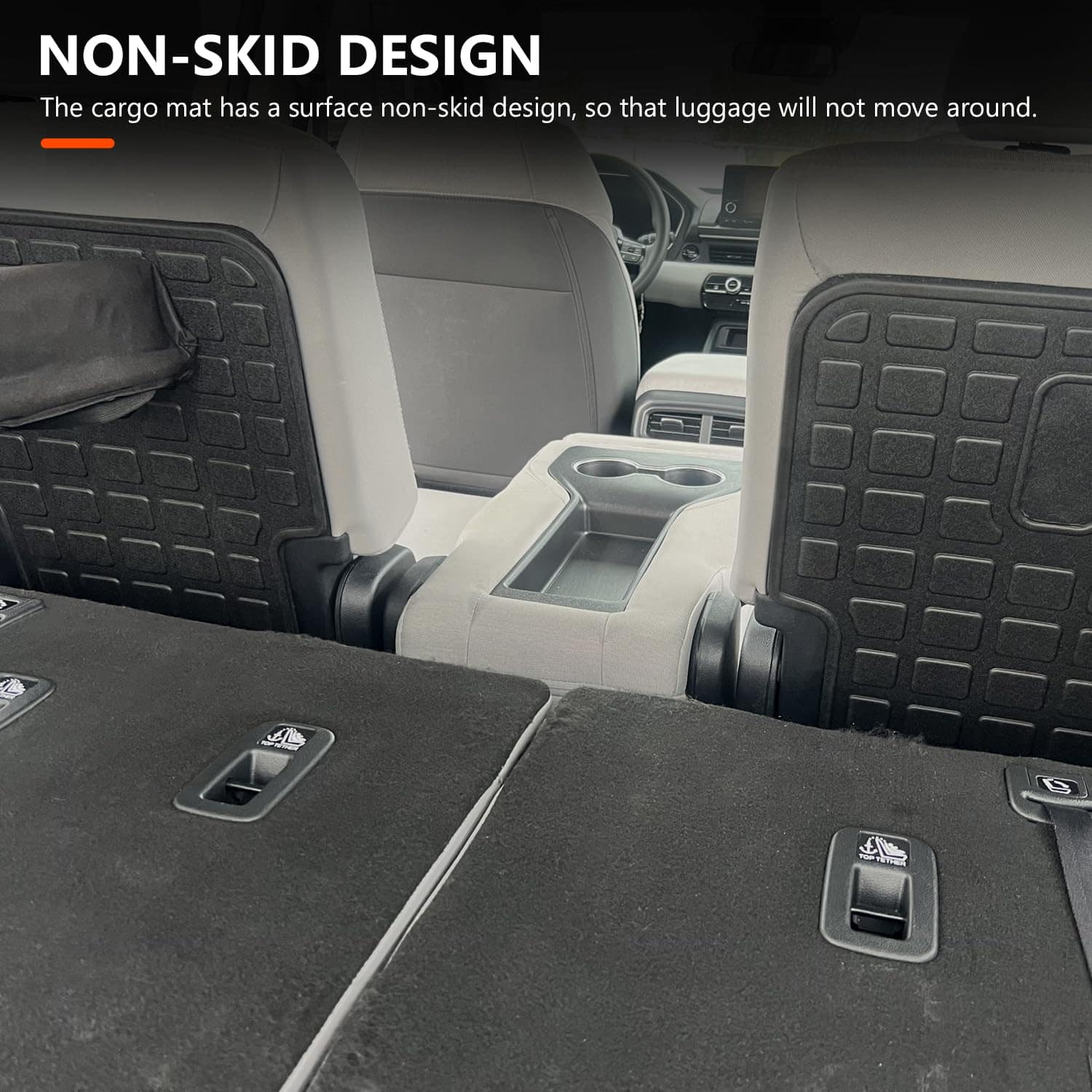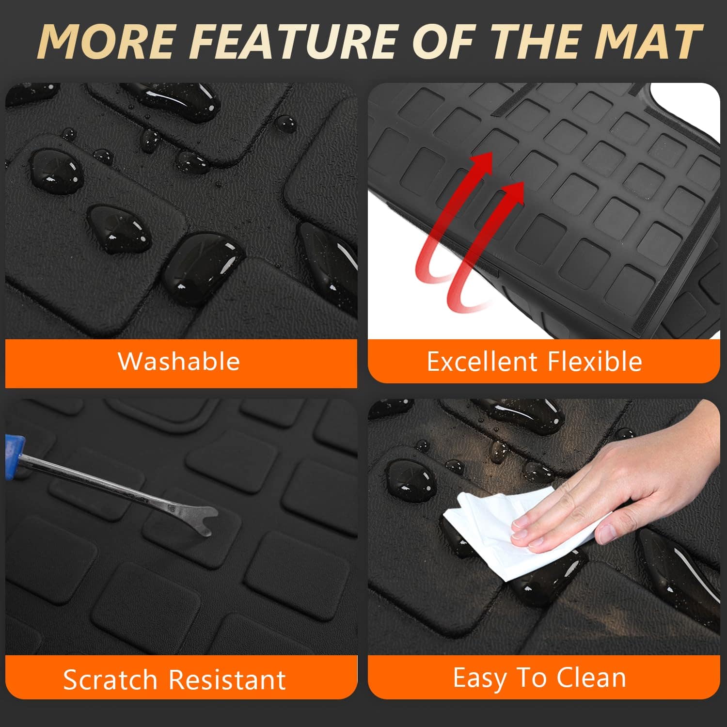 2. Material de Alta Calidad: Los revestimientos de carga están hechos de material de TPE de alta calidad, que es resistente a los arañazos, duradero y no tienen mal olor. Nuestros protectores de asientos traseros pueden soportar todo tipo de condiciones climáticas extremas, como fuertes lluvias o nevadas. Puedes limpiar los tapetes con agua y un paño.