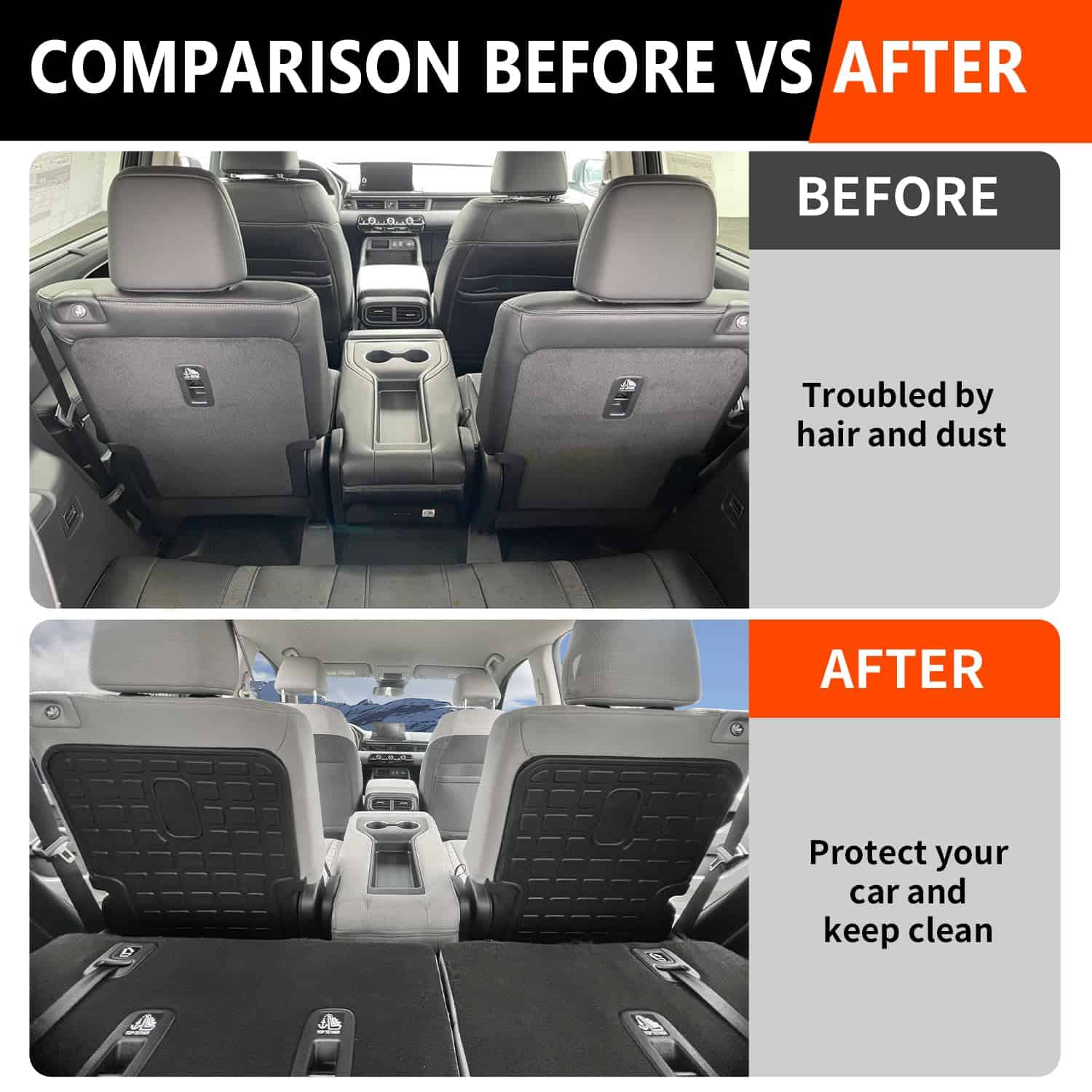 1. Ajuste Exclusivo: Nuestras alfombrillas de respaldo de 2da fila son compatibles con 2023 2024 Honda Pilot. ¡Atención: Son para modelos de 7 y 8 asientos! Son solo los tapetes de respaldo de 2da fila, solo 2 piezas. Por favor, confirma el año del modelo antes de comprar.