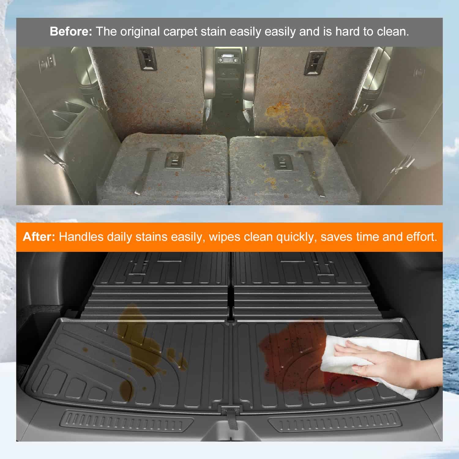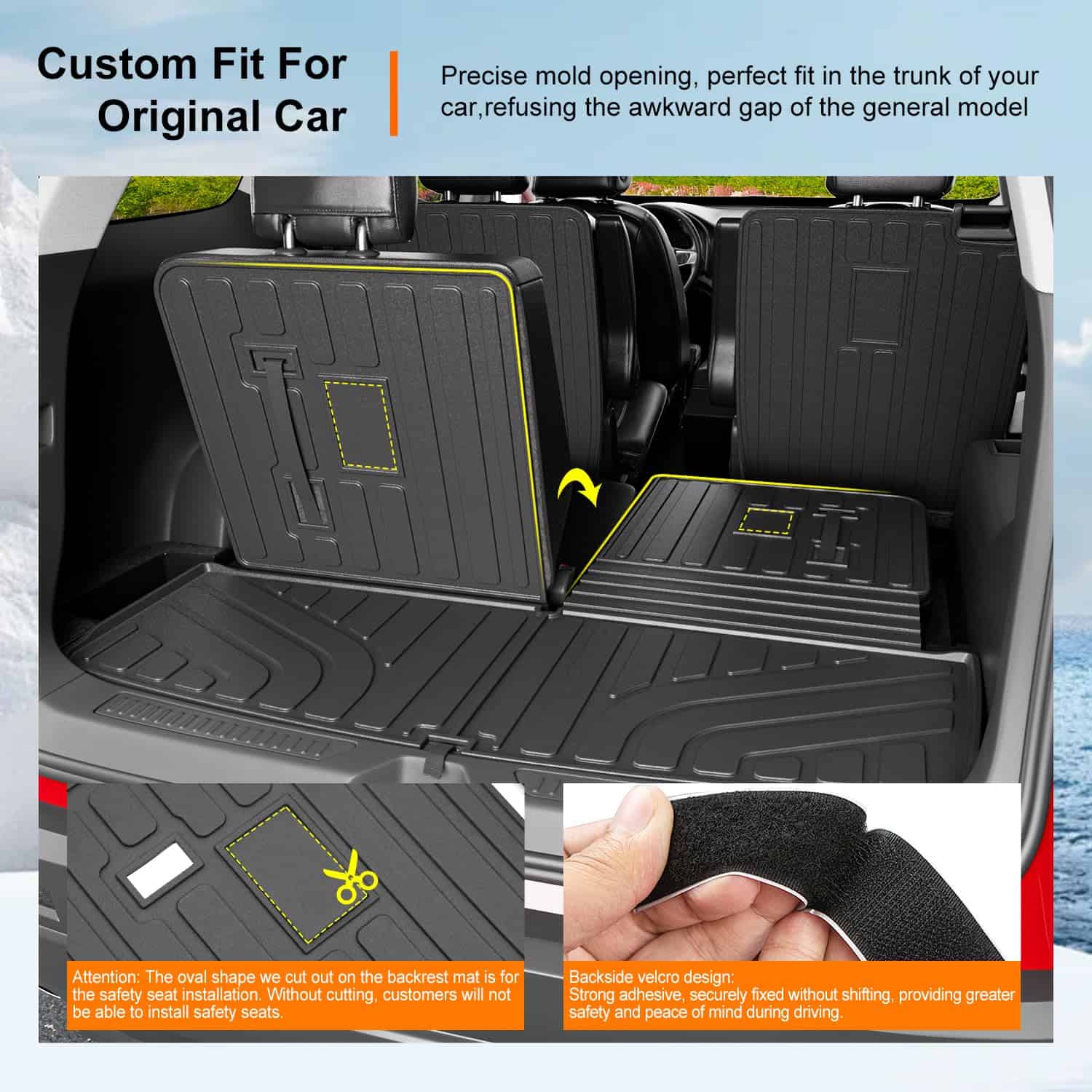 4. Instalación sencilla: El proceso de instalación de nuestro tapete de carga de reemplazo para GMC Acadia 2017-2023 con forro trasero de la fila trasera es muy sencillo. No se necesitan herramientas, solo colóquelo en su automóvil. Fácil de instalar o quitar. La parte trasera de nuestro protector del respaldo del asiento viene con velcro, que es fácil de desmontar y no daña el automóvil original.