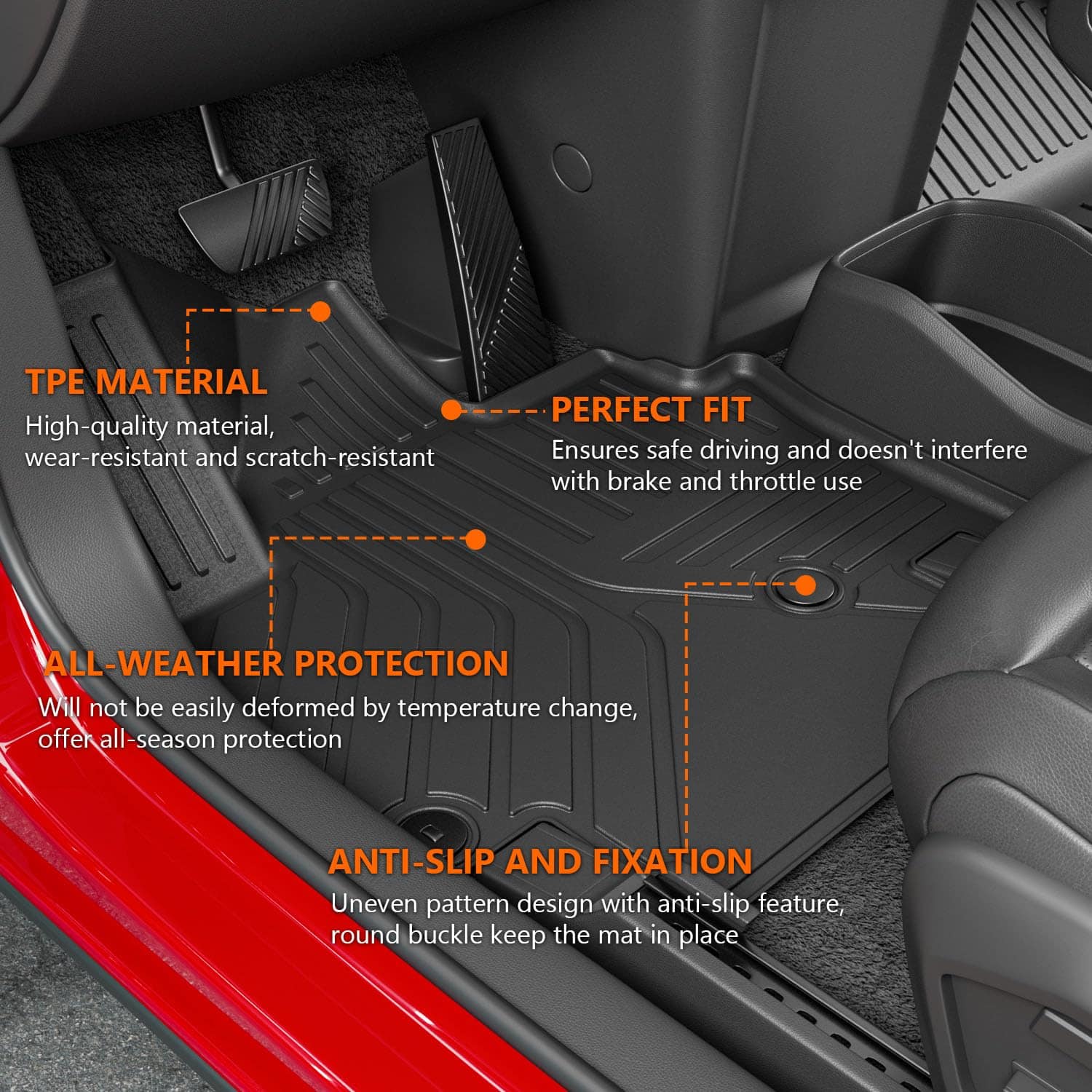 3. Función eficiente: El revestimiento de carga KIA EV9 2024 2025 compatible puede proteger la parte trasera de los asientos traseros de la suciedad y los daños. Al plegarse para transportar grandes artículos en el área del maletero como equipos deportivos, equipos de viaje de campamento, cochecitos para bebés, etc. No hay necesidad de preocuparse por que el polvo o los pelos de mascotas se peguen al asiento trasero, ayuda a mantener limpio el asiento del automóvil. Los revestimientos de piso protegen el piso interior del automóvil de la suciedad, el barro, el agua, la nieve y los desechos que traen los zapatos. Esto ayuda a prevenir manchas y daños en la alfombra original, manteniendo la estética y el valor del vehículo.