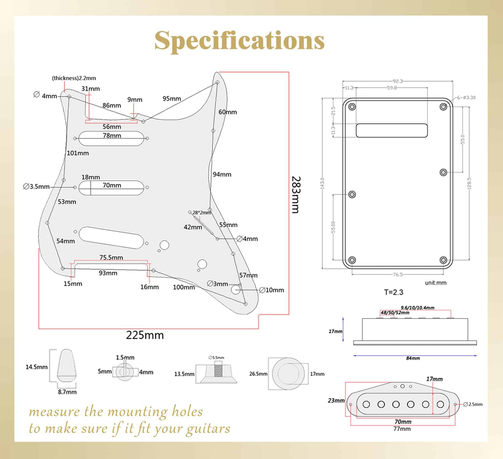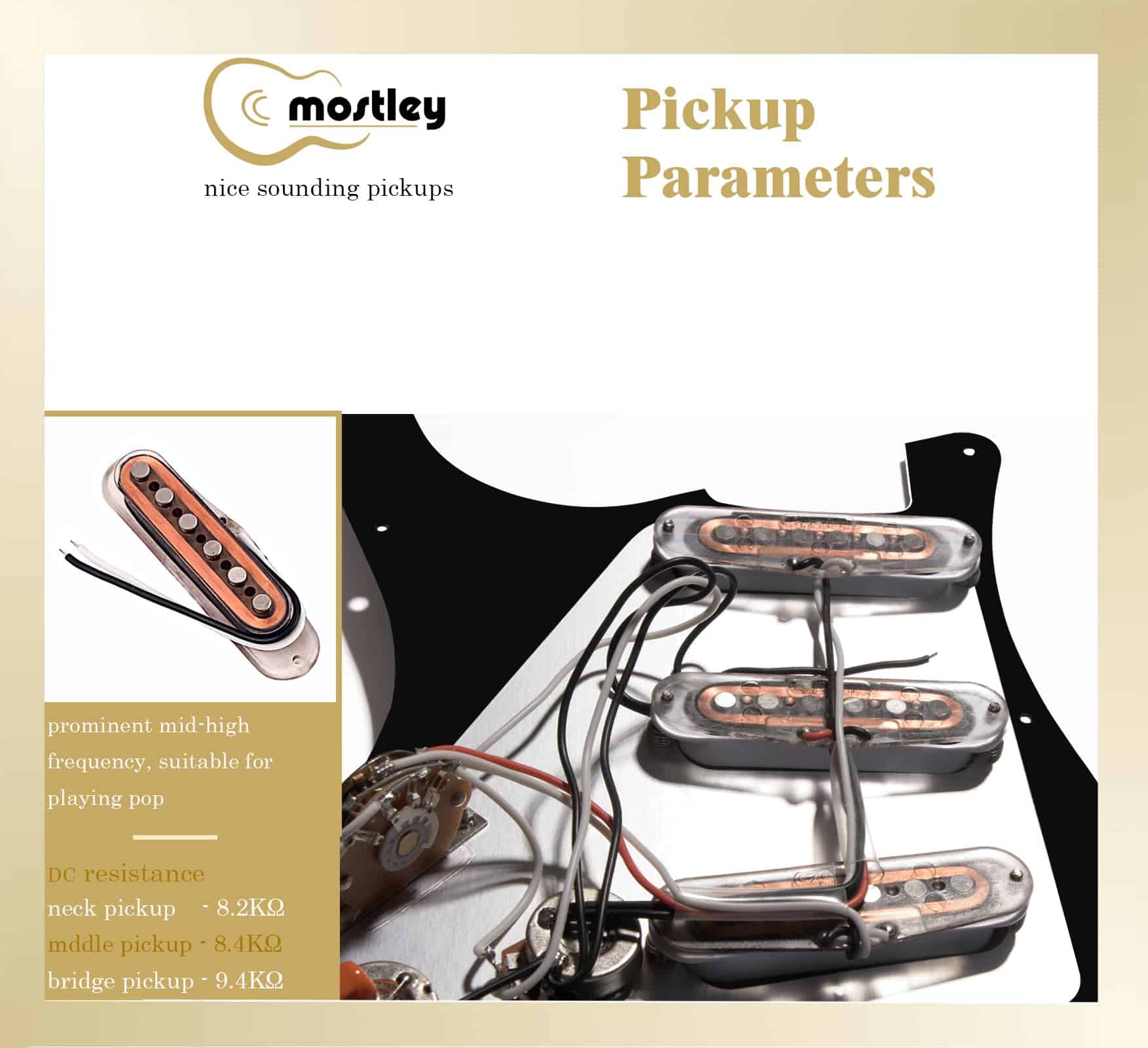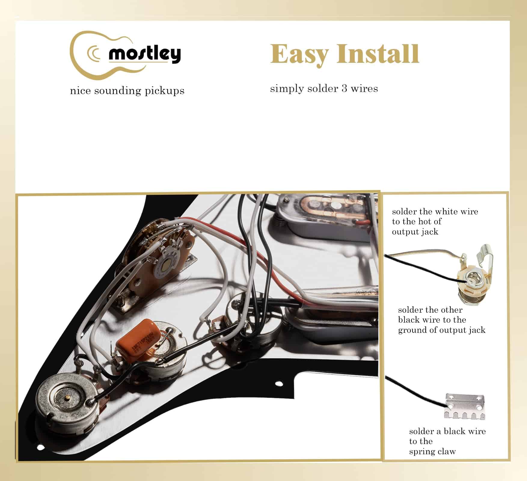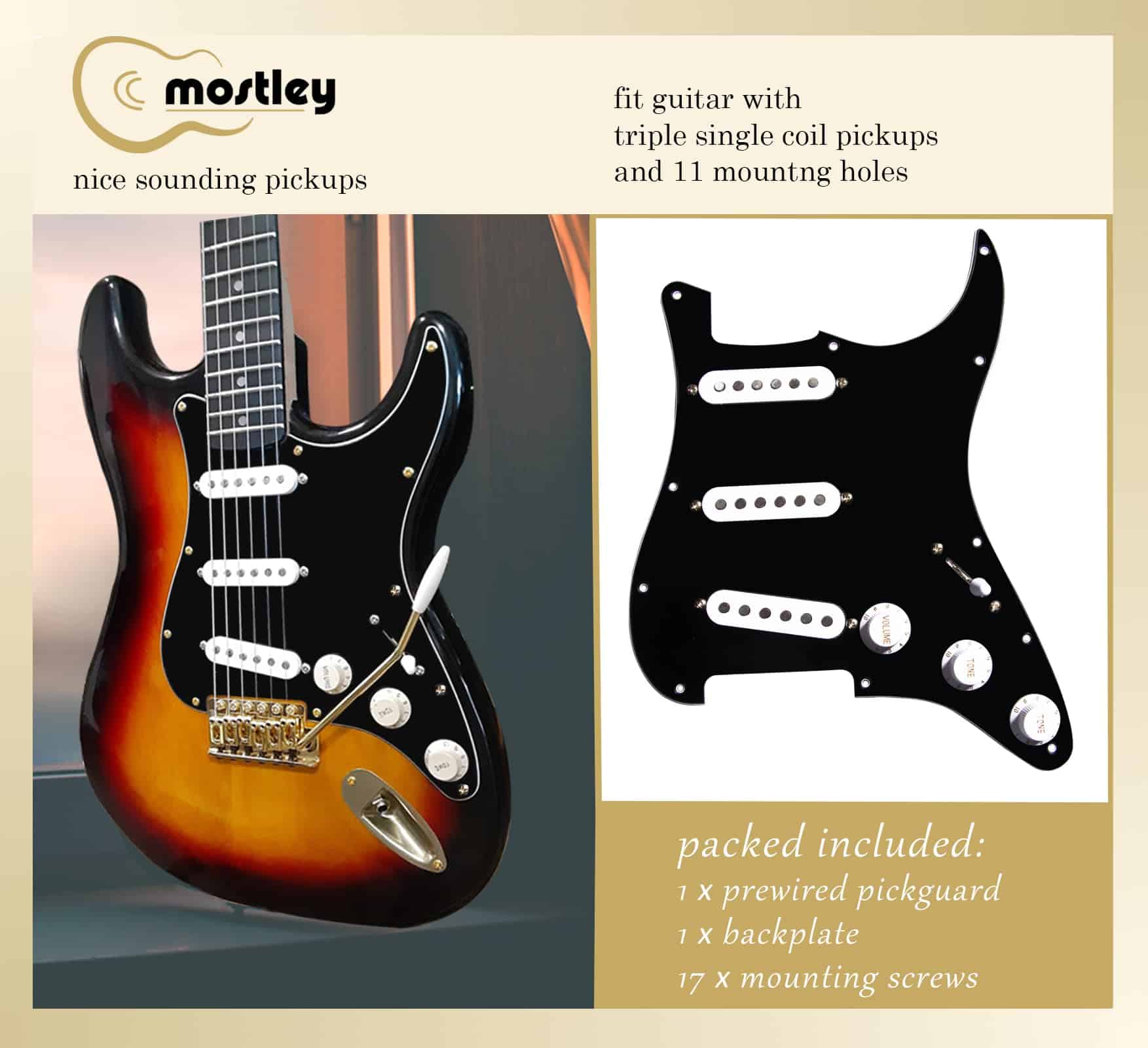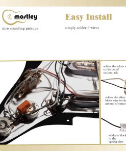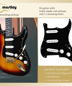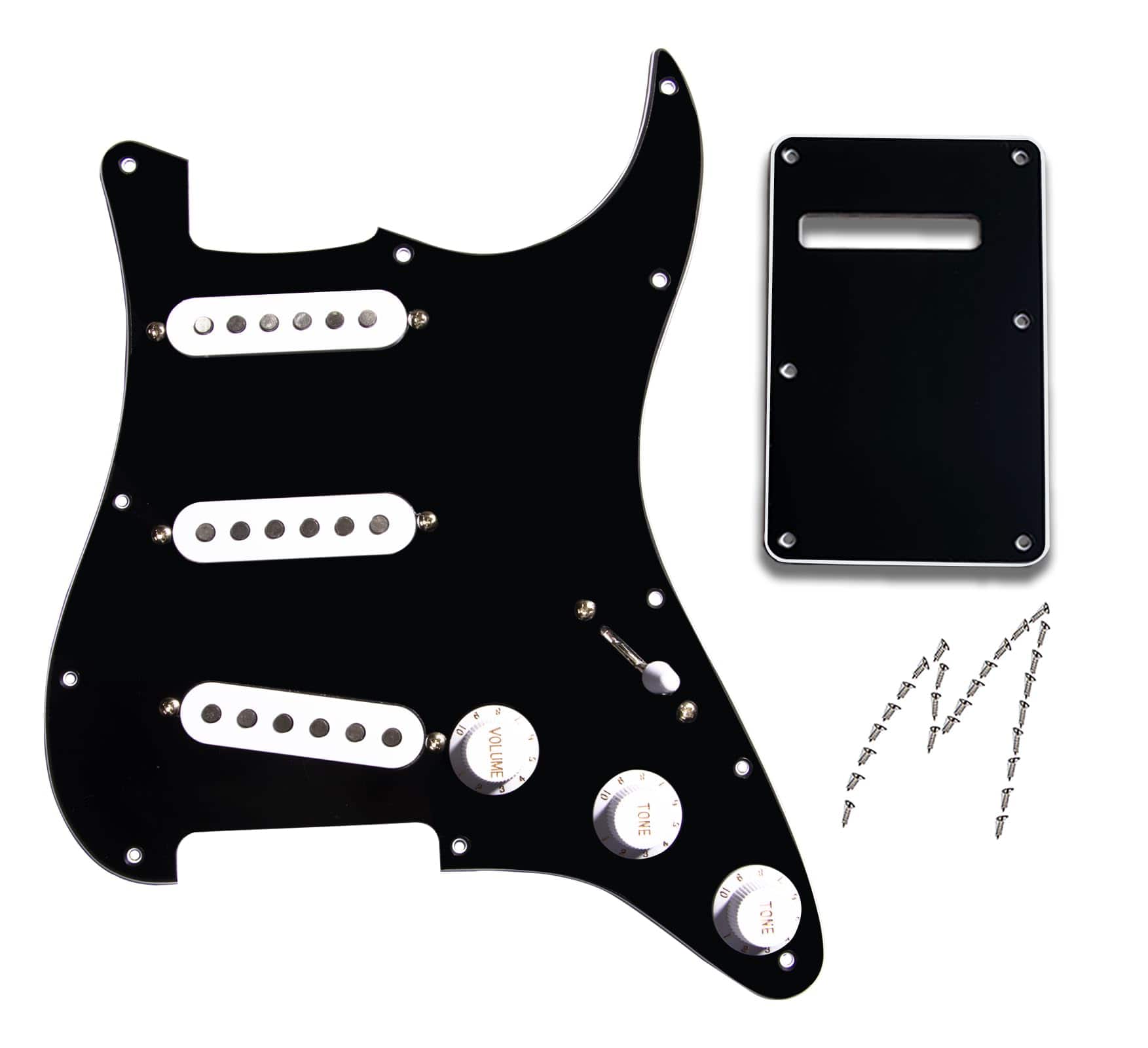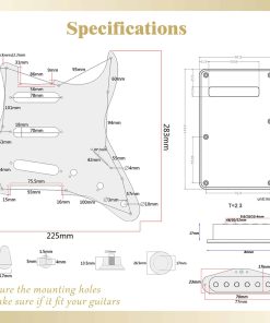 Pastillas y controles completamente cargados (interruptor, volumen y tono incluidos y cableados), solo necesitas soldar los cables de tierra y un cable caliente. Apto para guitarras eléctricas de la serie Stratocaster con 11 agujeros de montaje, configuración estándar de pastillas SSS, por favor mide el espacio de montaje de tu guitarra y compara con estas especificaciones. Incluye 1 x pickguard de guitarra cableado, 1 x placa trasera, 17 x tornillos de montaje; 1 x diagrama de cableado