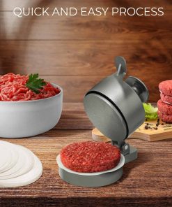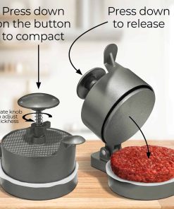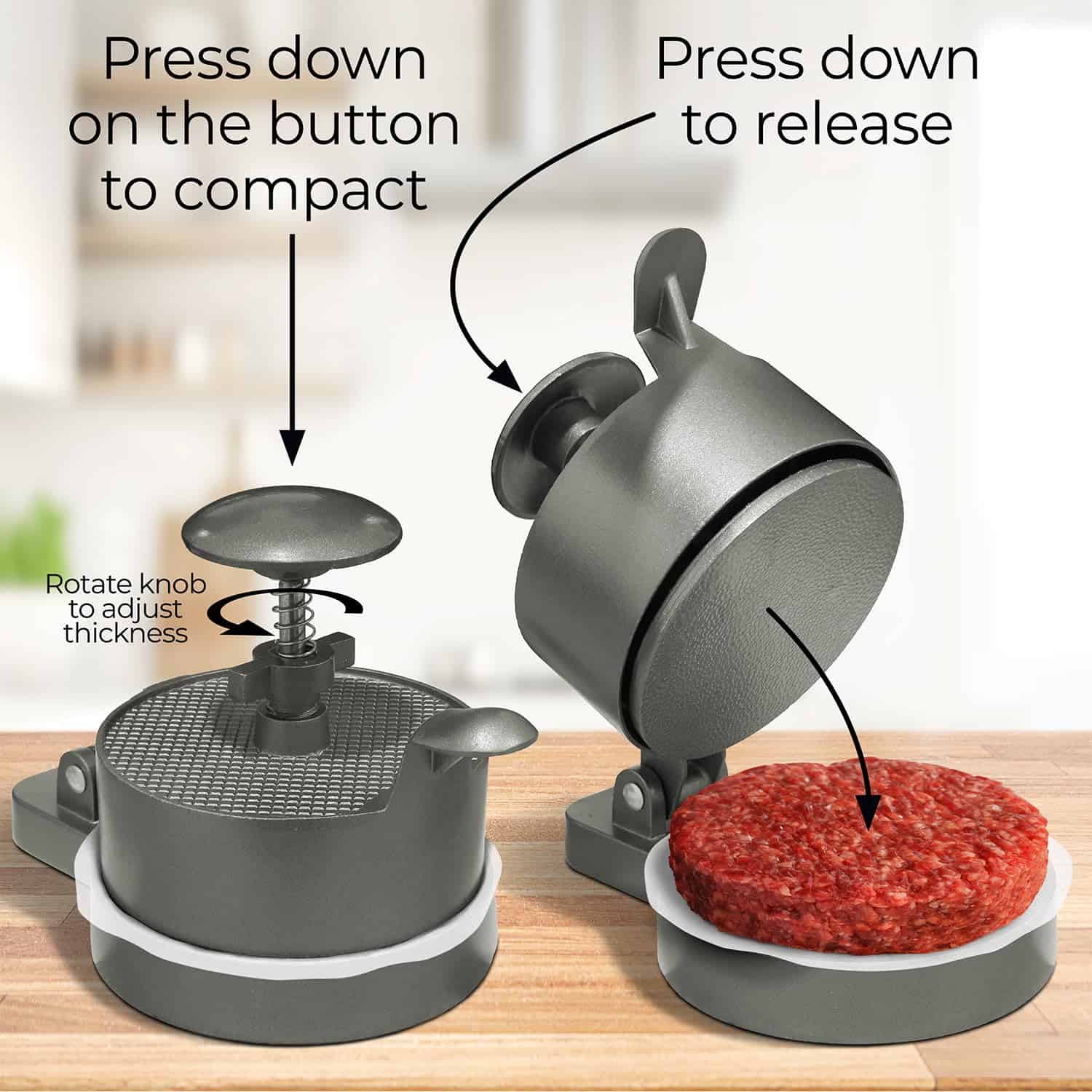 1. HAMBURGUESAS PERFECTAMENTE PRENSADAS: El botón de resorte compacta firmemente tus hamburguesas y las expulsa para una eliminación rápida y sin ensuciar. Sin pegajosidad, sin desgarros, solo hamburguesas perfectamente formadas.