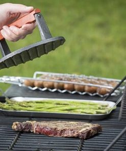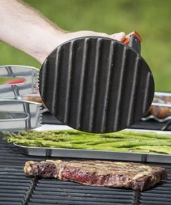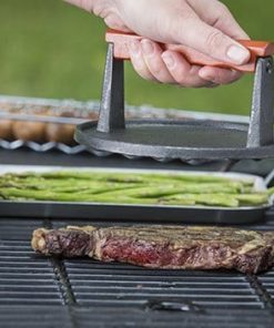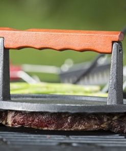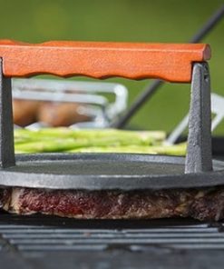 Prensa de Hierro Fundido Recubierta para Carne Redonda de 7 Pulgadas con Mango de Madera, Pequeña, Negro. Esta prensa de carne está diseñada para ser utilizada en parrillas de gas y de carbón. Es un accesorio para parrilladas de peso pesado, diseñado comercialmente. Fabricado con hierro fundido pre-sazonado y mango de madera para un manejo cómodo. Es antiadherente y fácil de limpiar, se recomienda lavar a mano para mantener su calidad. Añade esta prensa de hierro fundido a tus utensilios de cocina para lograr una cocción perfecta en tus carnes favoritas.