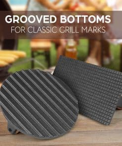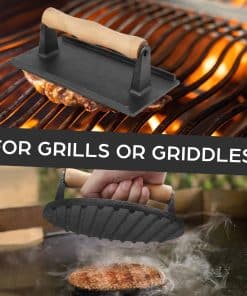 Prensa para hamburguesas LotFancy, redonda de 7″ y rectangular de 8″ x 4.2″ de hierro fundido para aplastar tocino, prensa de parrilla resistente con mango de madera para parrillas, sartenes o sartén antiadherente. Nuestra prensa de tocino está hecha de hierro fundido pesado de grado alimenticio; Use un peso de parrilla precalentado para cocinar su carne desde ambos lados y eliminar la grasa no deseada; úsela en la parrilla, plancha, ahumador, sartenes, horno, estufa y sartenes antiadherentes. Coloque la prensa de carne en la parrilla para precalentar, luego úsela en hamburguesas, tocino, jamón, sándwiches a la parrilla, hamburguesas, paninis, chuletas, filetes, quesadillas y más; una prensa de hierro fundido ayuda a cocinar la carne de manera uniforme desde ambos lados y acelera el tiempo de cocción. Cada prensa de bistec tiene un cómodo mango de madera que permanece frío durante el uso. Nuestra prensa de hamburguesas redonda tiene bordes para darle a su carne esas clásicas marcas de parrilla, la prensa de bistec rectangular tiene una textura de gofres para distribuir el calor de manera uniforme; la superficie texturizada también mantiene las prensas en su lugar, úselas como peso de tocino para evitar que el tocino se enrolle. Nuestras prensas para planchas están precondimentadas con aceite vegetal; Le sugerimos que las vuelva a condimentar antes de su primer uso; Lávese a mano y seque completamente, y ocasionalmente vuelva a condimentar con aceite (Tarjeta de Instrucciones Incluida)