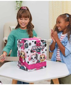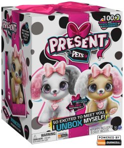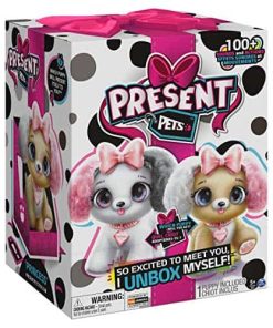 ¡Descubre Present Pets, los únicos regalos que se desempacan solos! Esperando dentro de cada caja temática de Fancy Pup hay un adorable cachorro interactivo solo para ti. ¡Está tan emocionado de conocerte que sale de su propia caja de regalo! Con uno de los dos Fancy Pups posibles disponibles en cada caja, ¡no sabrás qué cachorro estás obteniendo hasta que se desempaque! Para comenzar la gran revelación, desenvuelve la capa exterior de la caja y tira de la etiqueta de regalo. ¡La caja comenzará a sacudirse instantáneamente mientras tu dulce cachorro ansiosamente sale con sus patas! El panel frontal se abre, revelando qué Present Pets Fancy Pup está adentro: ¡Princesa o Kweenie! Cada Fancy Pup tiene ojos expresivos, un cuerpo de peluche suave y detalles de oro rosa en sus patas, orejas, collar y lazo. ¡Es tan lindo! ¡Cuando se revela, tu nuevo cachorro canta una canción de desempaque especial! Descubre la personalidad juguetona de tu mascota mientras te unes y juegas juntos. ¡Le encanta que la acaricies! ¡Acaricia su cabeza y te dará besos y dulces arrullos con gusto! ¡Hazle cosquillas en la barriga para que se emocione a jugar! ¡Su cola moverá más rápido, mientras golpea y revuelve sus patas y deja escapar la risa de cachorro más linda! ¡Tu cachorro incluso reconoce cuando le hablas! ¡Para más sorpresas divertidas, tu nuevo cachorro puede jugar juegos y realizar un truco instantáneo cuando presionas su botón trasero y acaricias su cabeza al mismo tiempo! Con más de 100 sonidos y acciones, Present Pets traen a la vida la verdadera felicidad de cómo es ser sorprendido con tu propio cachorro. Present Pets son un gran regalo para niños de 5 años en adelante y hacen que cualquier ocasión de regalos sea extra especial. ¡Desempaqueta todos los Present Pets, incluidos Glitter Pups Cocoa y Casey (se venden por separado) y lleva a casa una experiencia de desempaque inolvidable que toda la familia disfrutará! ¿Qué cachorro obtendrás?