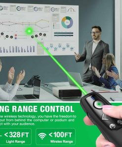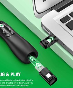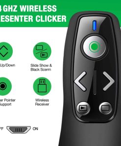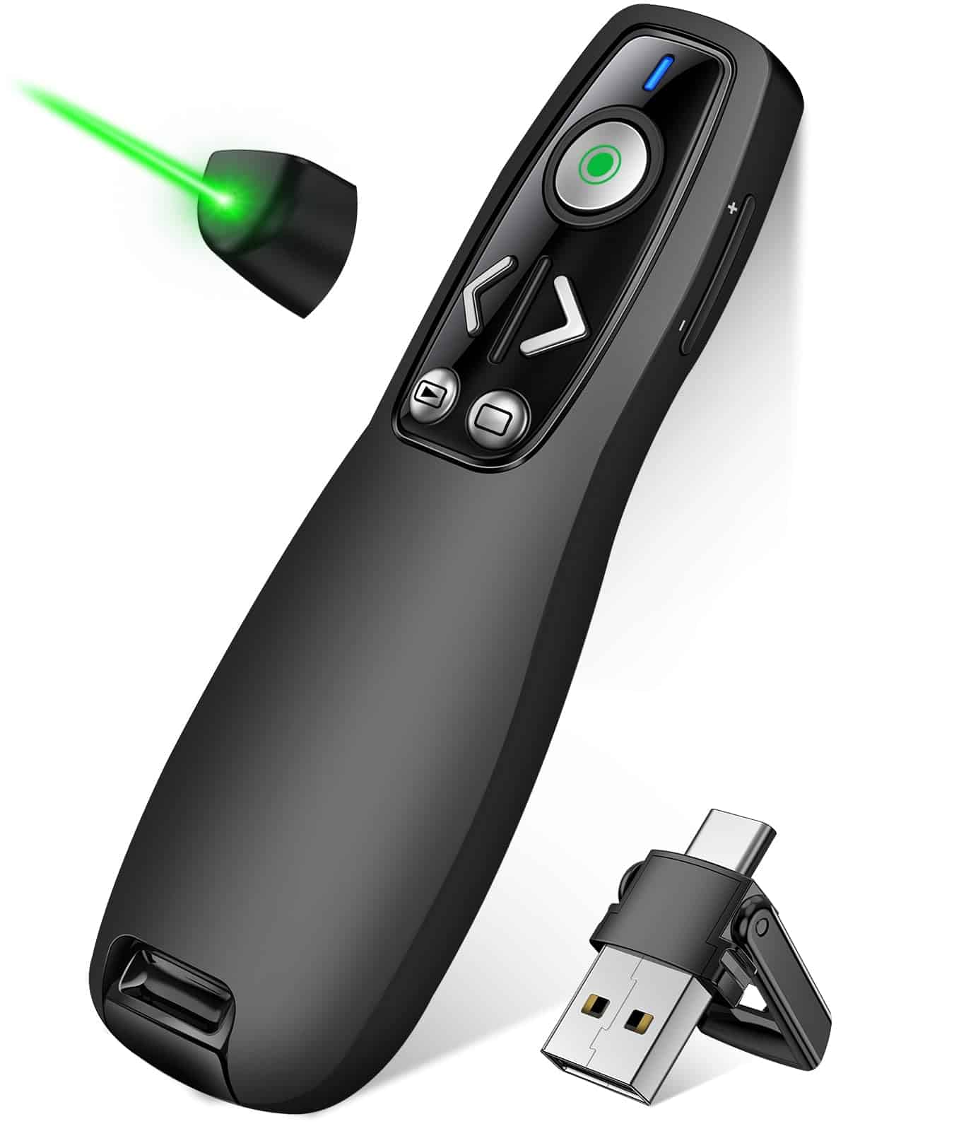 Presentador inalámbrico Clicker USB Tipo C 2 en 1 con Luz Verde para PowerPoint, Control de Volumen y Avance de Diapositivas de PowerPoint para Mac, Computadora, Portátil. Compatible con control de volumen, cambiar ventanas, pantalla completa/negra, subir/bajar página. Una tecla es una función. Las teclas contorneadas están ubicadas en el lugar correcto y son fáciles de encontrar al tacto. Por lo que tu presentación se desarrolla sin problemas, incluso en la habitación más oscura. Presentador de diapositivas USB Tipo C 2 en 1 con un diseño de doble cabezal único, USB y TYPE-C que pueden satisfacer todas tus necesidades. Puedes alternar sin problemas entre diferentes dispositivos como Mac, computadoras portátiles y pc, uno para múltiples ordenadores. En la parte inferior del presentador hay un imán que puede sostener tu dongle USB de forma segura (Funciona con 2 pilas AAA no incluidas). Luz verde brillante para presentaciones de PowerPoint, que es más fuerte que la luz verde. Es fácil de ver contra cualquier fondo, se puede utilizar para resaltar partes clave de una presentación, así que puedes asegurarte de que no se perderán el punto. FÁCIL DE USAR Conecta el receptor de 2.4 GHz al puerto USB de tu computadora y estarás listo para empezar la presentación. No es necesario configurar nada ni instalar software. El clicker para presentaciones de PowerPoint es adecuado para todas las edades, cuando tu presentación haya terminado, simplemente guarda el receptor dentro del presentador. AMPLIO RANGO DE CONTROL DEL CLICKER Con este presentador de puntero remoto, tienes la oportunidad de alejarte del ordenador o podio y conectarte con tu audiencia. El clicker de PowerPoint también tiene un rango de control inalámbrico de hasta 100 pies, por lo que puedes hacer tus conferencias más interactivas en lugar de simplemente hablar con tus estudiantes de pie en tu escritorio haciendo clic en botones