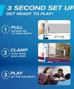 1. CONFIGURA PING PONG EN SEGUNDOS – Transforma instantáneamente cualquier mesa en una mesa de ping pong con nuestro práctico set portátil de ping pong. Configuración sin problemas: ajusta la red para que coincida con el ancho de cualquier mesa; activa la palanca azul para abrir las abrazaderas; y adjúntala de forma segura al lado de cualquier mesa. Diviértete jugando ping pong en cualquier lugar con esta configuración rápida y fácil, creando juegos inolvidables sobre la marcha.