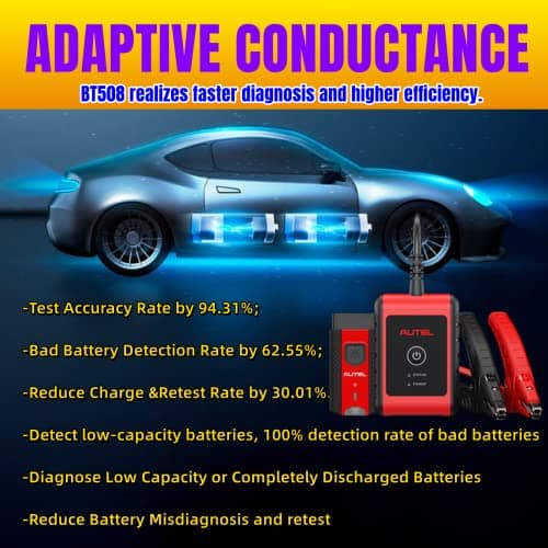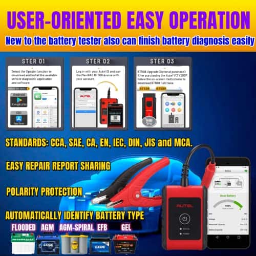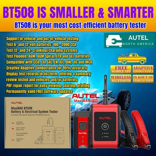 Probador de batería Autel BT508: EXPERTO EN BATERÍA DE VEHÍCULOS Autel BT508 puede probar todas las baterías de 6V y 12V 100-2000CCA, incluidas las baterías más comunes de tipo Flooded, AGM, AGM Spiral, EFB y GEL, y compatible con los estándares CCA, CA, SAE, EN, IEC, DIN, JIS y MCA. BT508 es su probador de batería más rentable para diagnosticar todas las baterías de vehículos de pasajeros, una herramienta imprescindible en su garaje. Nota: NO es universal. Por favor, verificar la cobertura. Conductancia Adaptativa, Más del 95% de Precisión La Tecnología de Conductancia Adaptativa es una creación intuitiva de Autel para pruebas de batería de vehículos, a diferencia de las herramientas de prueba de batería promedio con un alto porcentaje de diagnósticos erróneos e resultados de diagnóstico inexactos, Autel MaxiBAS BT508 le permite realizar pruebas sin descargar las baterías, y puede probar baterías descargadas o casi completamente descargadas con las mediciones más precisas, sin repetir pruebas, sin diagnósticos erróneos, solo los resultados de prueba más precisos. Pruebas Dentro y Fuera del Vehículo El analizador de baterías más nuevo de Autel BT508 de 2022 admite pruebas dentro y fuera del vehículo. La prueba dentro del vehículo incluye prueba de batería, prueba de arranque y prueba de generador para determinar el estado de salud de la batería, el arrancador y el generador respectivamente. O si necesita probar una batería independiente, BT508 también puede ayudar a verificar el estado de salud de la batería solamente, el resultado de la prueba instantánea y el consejo de mantenimiento se muestran en la pantalla. Analizador de Capacidad de Arranque del Vehículo La herramienta de prueba de batería de automóvil Autel BT508 le permite probar la capacidad de arranque del motor de arranque y la condición de carga del generador. Siga las instrucciones en pantalla para completar la prueba, se le expondrá con Resultados de Arranque que incluyen Voltaje de Arranque y Tiempo de Arranque. La Prueba del Generador también está disponible para presentar la condición de carga, Voltaje de Salida, Ripple. Instrucciones paso a paso, sin preocupaciones incluso si eres un principiante. Nota: NO es universal. Operación Fácil para el Usuario Busque ‘Battery Test’ en Google Play o la Apple Store para descargar la aplicación en su teléfono celular, escanee el código QR en la parte posterior del BT508 para el emparejamiento BT. La pestaña de información del vehículo y la información de la batería se completarán automáticamente cuando esté conectado, luego elija la suya para comenzar la prueba de batería. También puede verificar fácilmente el historial de pruebas del vehículo y la batería. NOTA: BT508 debe usarse con un teléfono celular o tablet de diagnóstico Autel compatible con BT508. Compra sin preocupaciones, Actualizaciones Gratuitas de por Vida Autel MaxiBAS BT508 disfruta de actualizaciones gratuitas de por vida, consulte el BMS Manager regularmente para descargar el firmware más reciente de forma gratuita todo el tiempo. BT508 está respaldado por 30 días de devolución y reembolso completo o reemplazo nuevo, y garantía de calidad de 1 año.