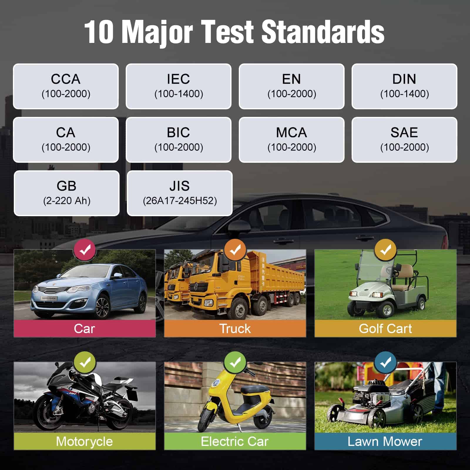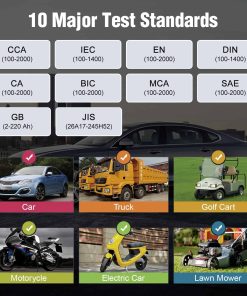 -Los resultados de la prueba se basan en los estándares CCA, IEC, EN, DIN, CA, BCI, MCA, SAE, GB, JIS.