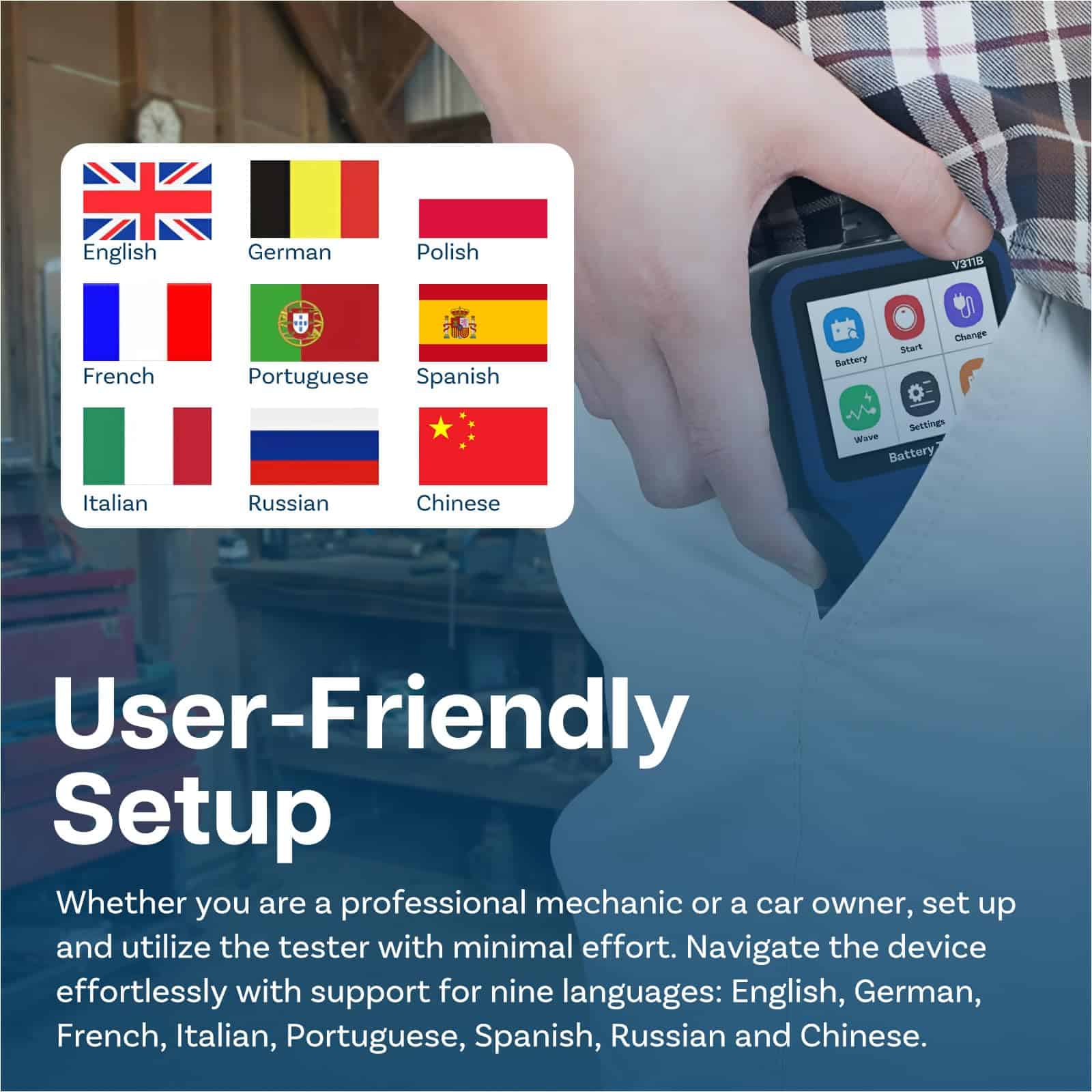 5. Configuración fácil de usar: Navegue por el dispositivo sin esfuerzo con soporte para seis idiomas: inglés, francés, alemán, portugués, italiano y ruso. La interfaz intuitiva y la clara pantalla 128×64 facilitan la operación para cualquier usuario. Ya sea un mecánico profesional o un propietario de automóvil, configure y utilice el probador con un esfuerzo mínimo.