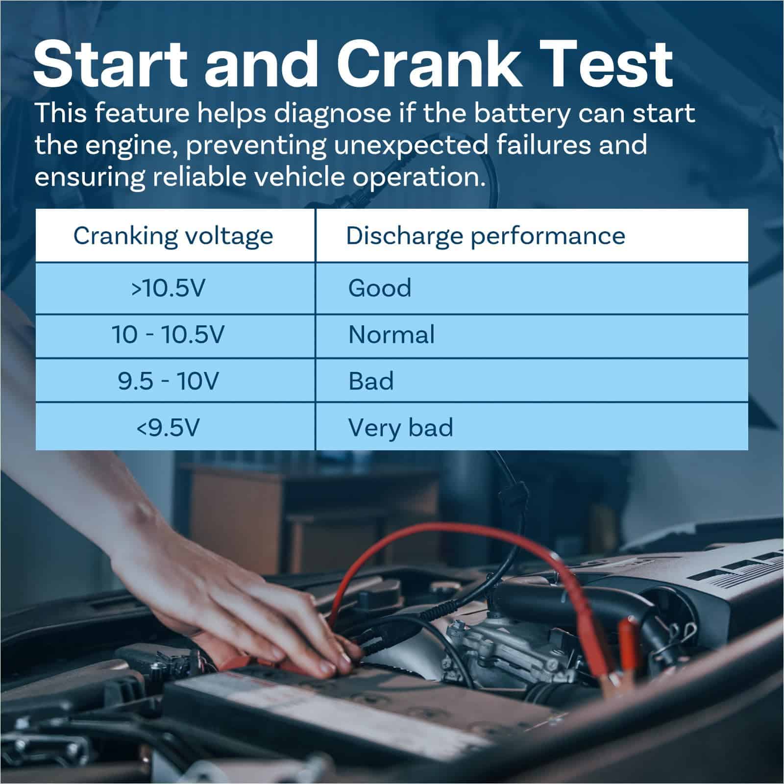 2. Prueba de arranque eficiente: Realice medidas precisas de amperios de arranque en frío (CCA) para determinar la confiabilidad de su batería como batería de arranque. Esta función es crucial para diagnosticar problemas de arranque, asegurando que su vehículo arranque suavemente incluso en condiciones frías. Ideal para propietarios de automóviles y técnicos de mantenimiento que se ocupan de problemas de arranque frecuentes.