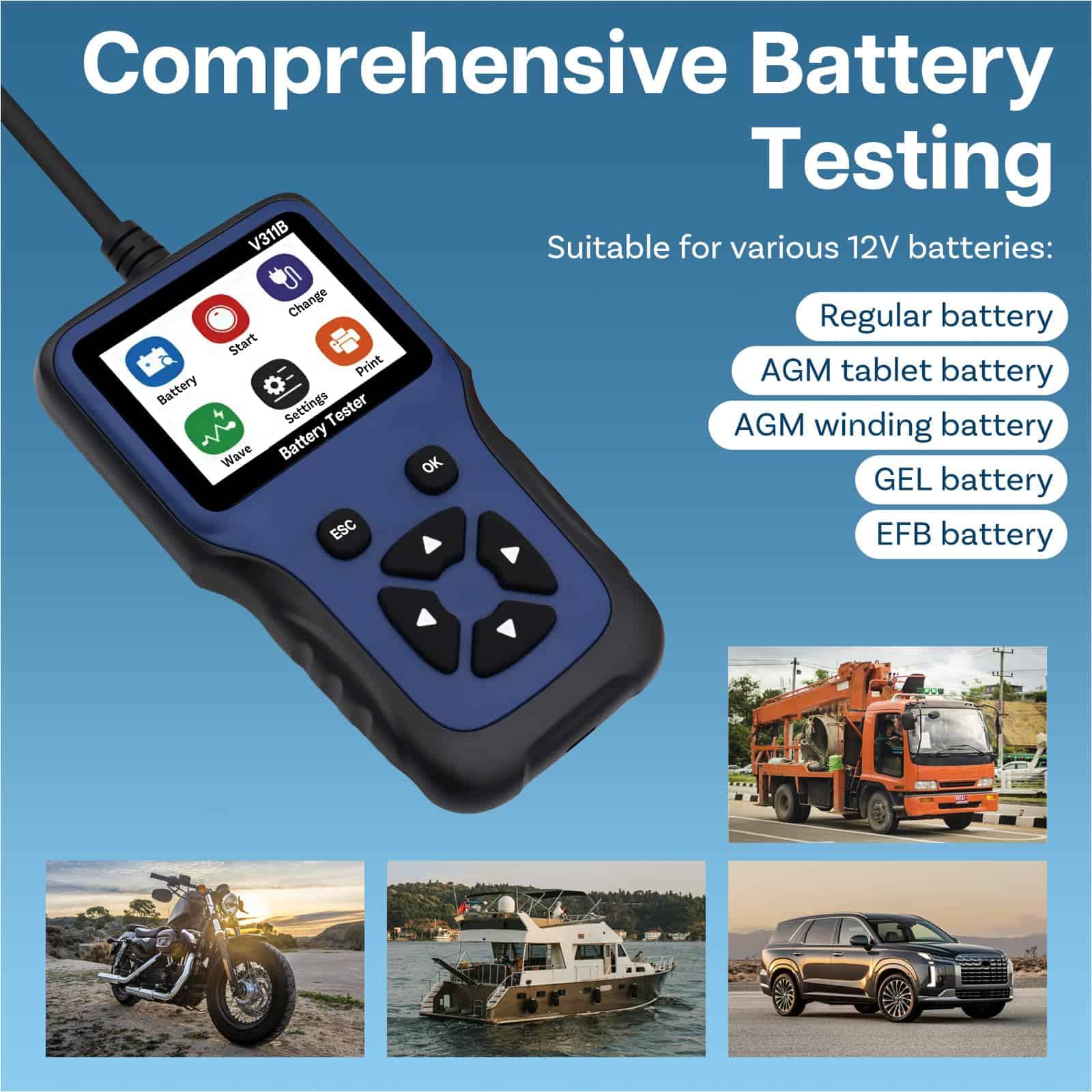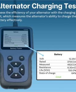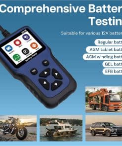 1. Prueba exhaustiva de la batería: Verifique fácilmente la salud de su batería de automóvil, mostrando datos cruciales como estado de la batería, voltaje y resistencia interna. Adecuado para varias baterías de 12V, incluidos los tipos regulares, AGM tablet, AGM winding, GEL y EFB. Asegure que su batería esté en condiciones óptimas para un rendimiento fiable.