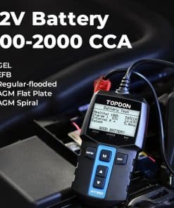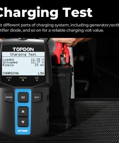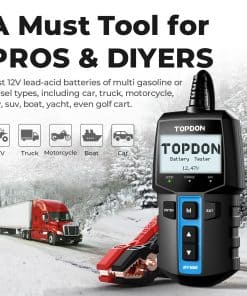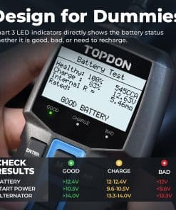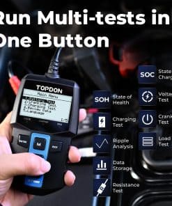 El probador de batería para automóvil TOPDON BT100 es una herramienta útil tanto para usuarios individuales como para técnicos profesionales. Funciona en todas las baterías de plomo ácido de 12 voltios con un rango mucho más amplio (100-2000 CCA). Puede verificar la salud general de tu batería, medir la capacidad de arranque y verificar su estado de envejecimiento. Diferentes test de batería mostrados: 1. Luz verde ENCENDIDA: Bueno, la batería está en buenas condiciones, puedes usarla con confianza; 2. Luz amarilla ENCENDIDA: Recarga, es una buena batería con baja corriente, y por favor recárguela antes de su próximo uso; 3. Luz roja ENCENDIDA: Reemplazar, la batería está casi o ya está rota, y debes reemplazarla. Prueba de arranque para conocer el estado del sistema de arranque. 1. Al ingresar a la prueba de arranque y arrancar el motor según se indica, el probador completará automáticamente la prueba; 2. El probador mostrará el resultado, incluido el voltaje de arranque real y el tiempo de arranque real; 3. Si el valor de voltaje de arranque es menor que 9.6V, el sistema de arranque se considera anormal; 4. Si el valor de voltaje de arranque es mayor que 9.6V, el sistema de arranque está OK. Prueba de carga para conocer más sobre el voltaje de carga. 1. Normal – la salida del generador es normal, no se detecta ningún problema; 2. Bajo – verifica la correa de transmisión del generador y la conexión entre el generador y la batería o sigue la sugerencia del fabricante para eliminar una falla del generador; 3. Alto – reemplaza la asamblea del generador o un regulador para evitar daños en la batería; 4. No hay salida de voltaje – revisa el cable de conexión del generador y la correa; 5. Prueba de diodo – al menos un diodo está dañado si el voltaje de ondulación es demasiado alto. Múltiples idiomas: Inglés, ruso, español, francés, italiano, alemán.