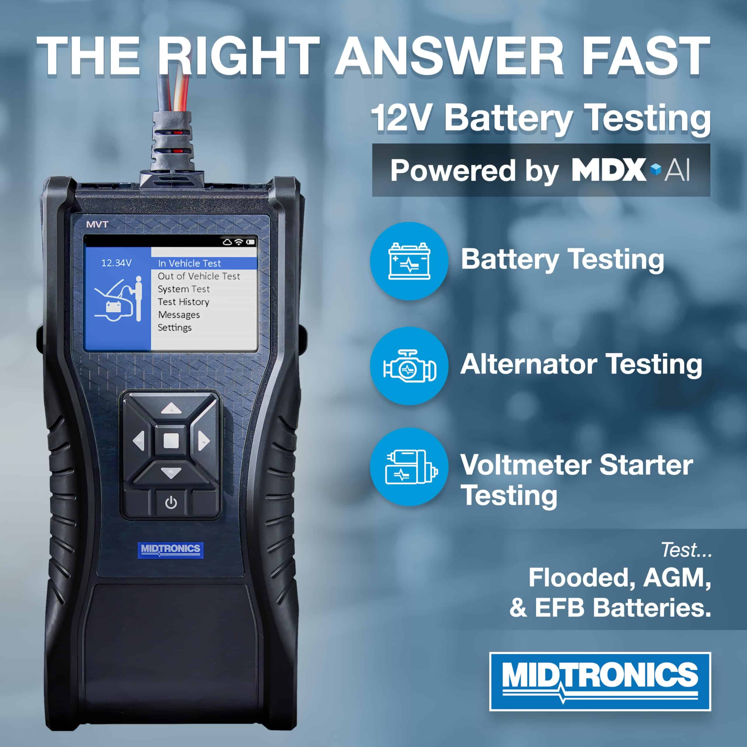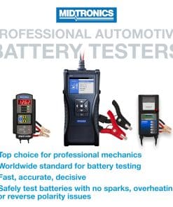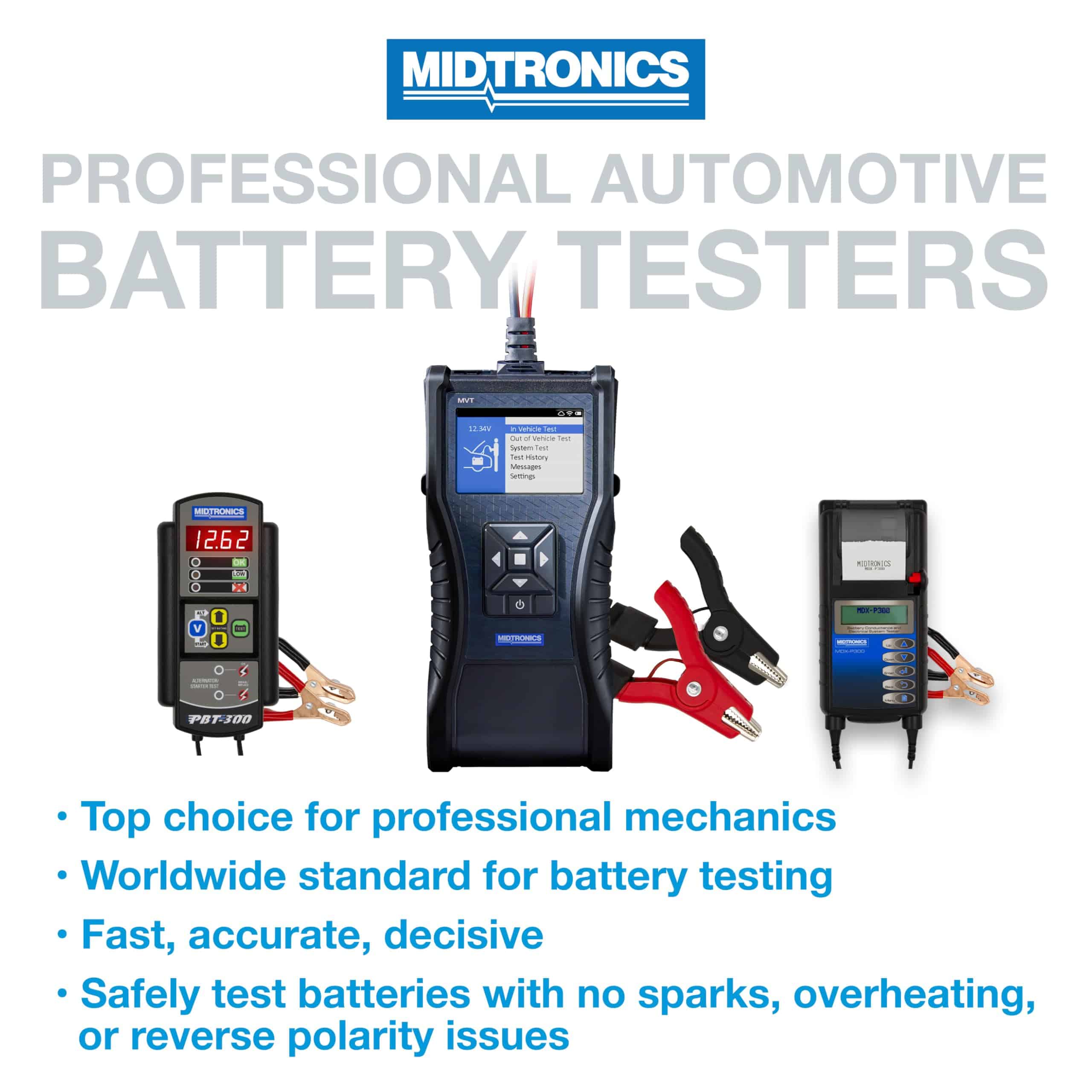 Midtronics ofrece varios modelos de probadores de batería, incluidos MVT-100, MVT-100P, MVT-200 y MVT-200P, cada uno con características únicas como cables de 30�, pinzas Mueller, pinzas Powersport e impresoras integradas para satisfacer una variedad de necesidades de pruebas. Con el probador de batería portátil Midtronics MVT-200P, obtendrá mediciones precisas y confiables para una amplia gama de aplicaciones de baterías.