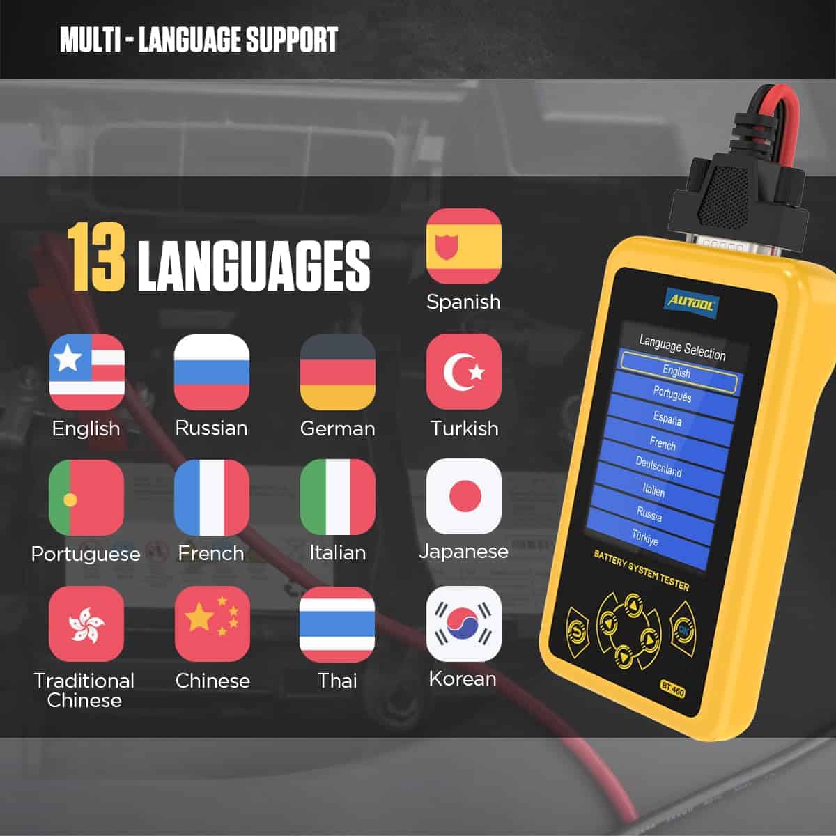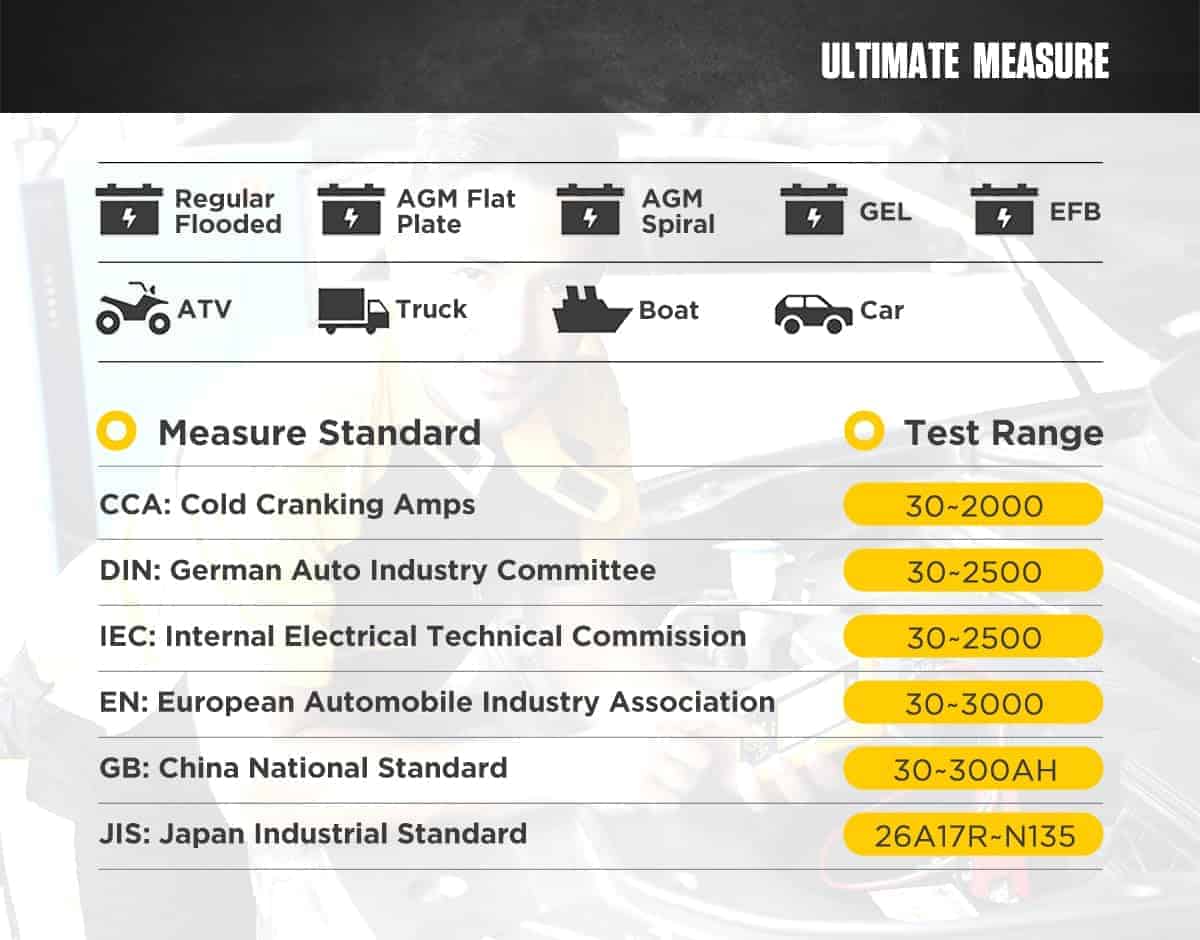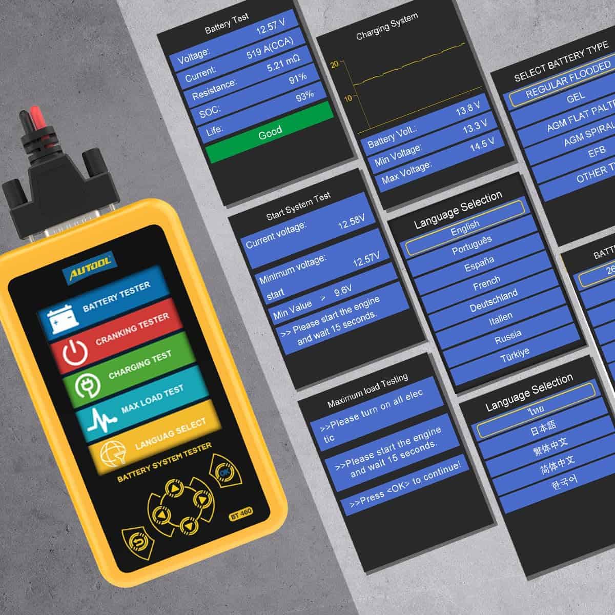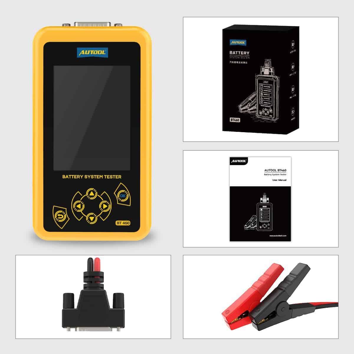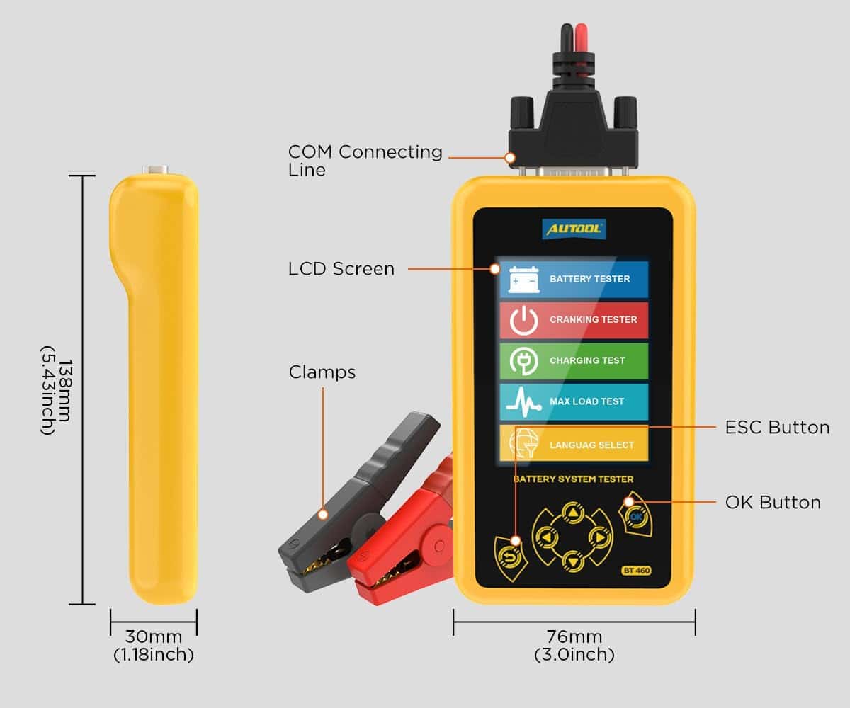 Ventaja: 1. Simple y fácil de usar 2. Prueba de baterías en y fuera del vehículo 3. Resultados precisos en milisegundos En comparación con otros probadores, los resultados de la batería Au tool BT460 son los mismos (tolerancia 15) al probar al mismo tiempo 4. Análisis de vida útil de la batería 5. Resultado del análisis: Bueno o Reemplazar 6. Gran pantalla LCD de fácil lectura. 7. Resultados de prueba basados en estándares JIS, EN, DIN, SAE y IEC. 8. Prueba del sistema de arranque del vehículo — tiempo de arranque, voltaje y estado. 9. Prueba del sistema de carga del vehículo — voltaje de carga, voltaje sin carga, estado de ondulación y estado del sistema de carga.