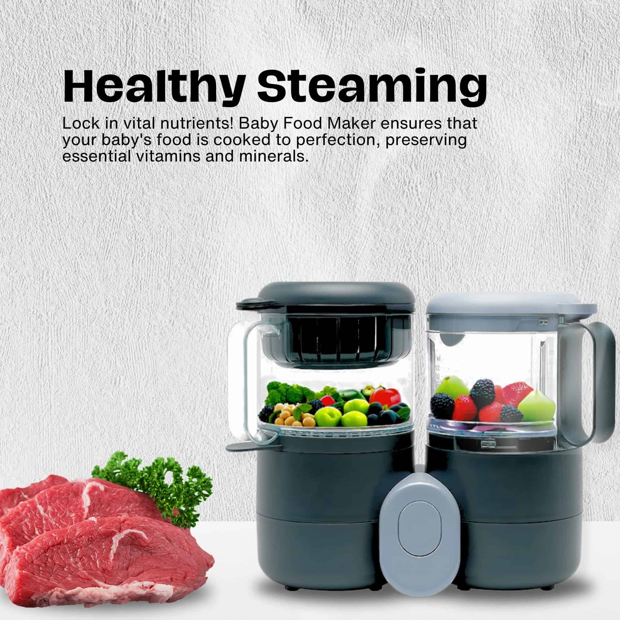 4. DESCONGELA Y RECALIENTA: Descongela de forma segura los alimentos para bebés congelados y recalienta rápidamente las comidas a la temperatura perfecta. Nuestro fabricante de comida para bebés y vaporizador 4 en 1 agilizan el proceso, permitiéndote servir comidas frescas y calientes en minutos.