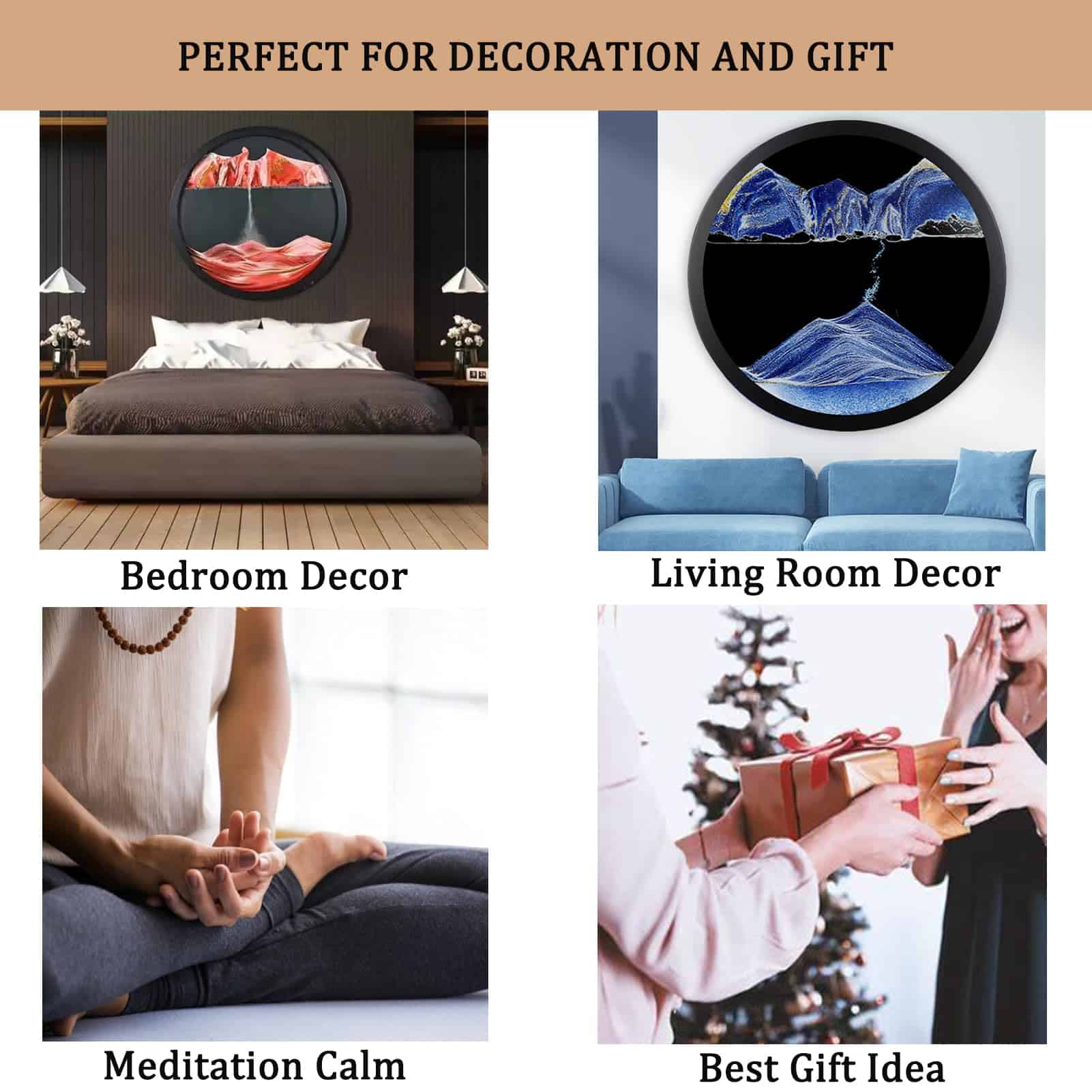Cada vez que giras el Arte de la Arena, obtendrás una visión dinámica de la quicksand diferente. Es un regulador para la tensión y la fatiga en tu trabajo, pero también una escena peculiar en tu pared, así como un tesoro de juego para tu ocio y entretenimiento. El encanto de la naturaleza con sus colinas onduladas y sus olas embravecidas puede ser capaz de cultivar tu sentimiento y traerte un estado de ánimo agradable. Cómo ajustar la velocidad de la quicksand La quicksand cae demasiado lentamente: extrae un poco de aire. Operación específica: enfoca las burbujas de aire juntas (necesitas enfocar el aire en el agujero, también necesitas asegurarte de quitar la arena), y luego inserta el regulador de aire (jeringa) en el agujero de aire para extraer el aire. Quicksand cae demasiado rápido: agrega un poco de aire. Operación específica: concentra las burbujas de aire juntas (necesitas concentrar el aire en el agujero, también necesitas asegurarte de quitar la arena), y luego inserta el regulador de aire (jeringa) en el agujero de aire para inyectar aire. Nombre de la Especificación: Imagen de Arte de Arena en Movimiento Montada en la Pared Tamaño: 17.3 pulgadas / 24 pulgadas Material: Vidrio + Arena + Marco de Madera Sólida Color: Verde / Azul / Morado / Naranja / Negro Multifuncional: Hogar, Sala de Estar, Cocina, Dormitorio, Comedor, Oficina Otra Decoración de Escenas Múltiples Cómo jugar: 1. Después de sacar la pintura de arena, Instalado en la pared 2. Permanece quieto durante 20-30 minutos 3. Gira manualmente la pintura de arena a 180 grados, el aire fluye a través de la parte inferior de la quicksand, y cuanto más uniforme sea la distribución, mejor será el efecto