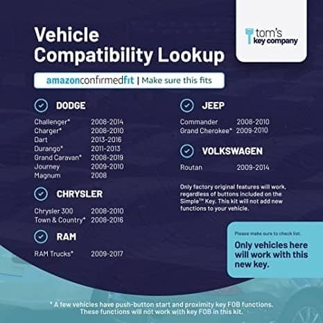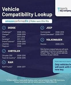 3. Compatible con varios vehículos – ¿Tienes un Chrysler, Dodge, Jeep, Ram o Volkswagen ¡Te tenemos cubierto! Nuestro kit de reemplazo de llavero de arranque remoto está creado para adaptarse a diferentes modelos de estas marcas de coches. Nota: Consulta los detalles de la compatibilidad del año, marca y modelo del coche.