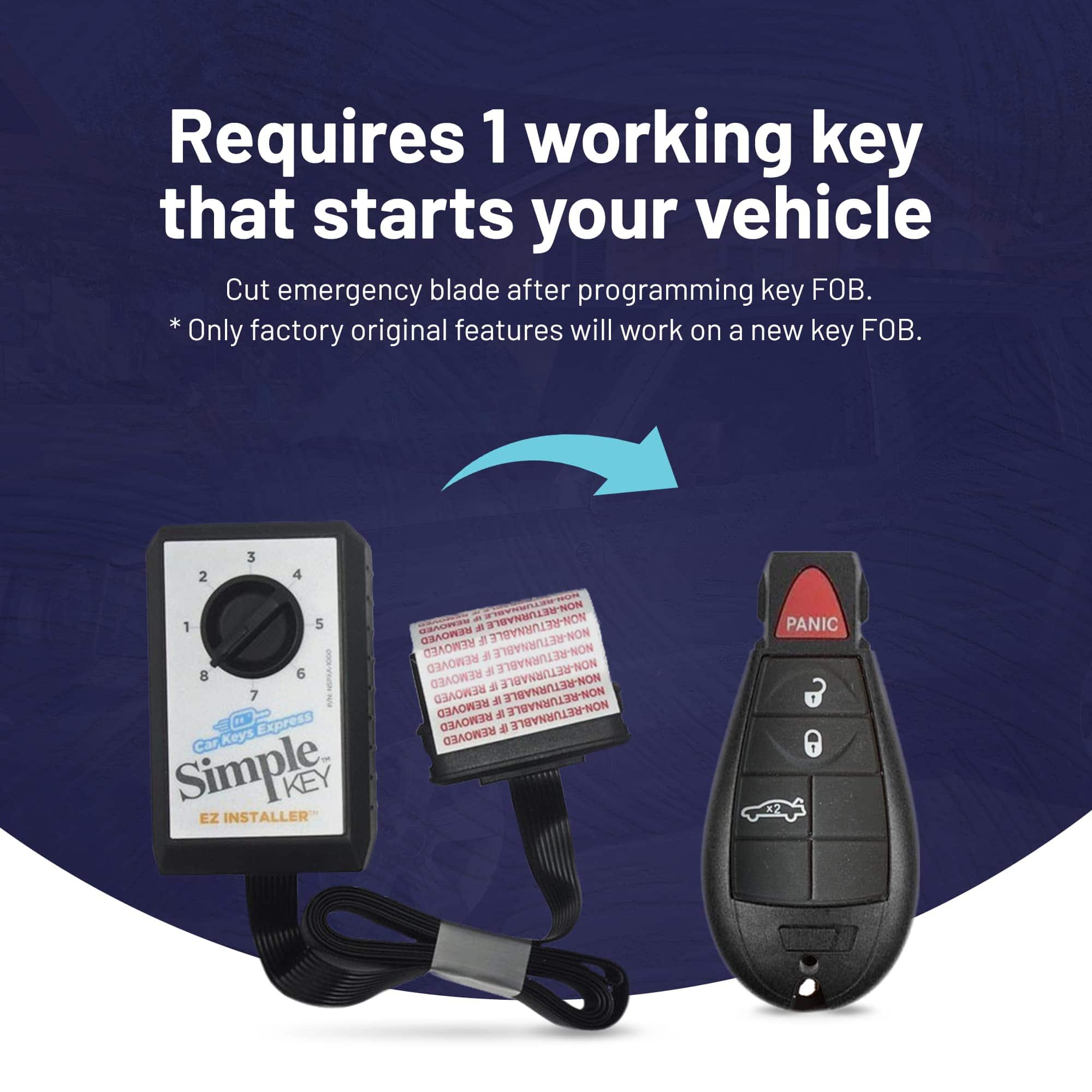 Simple Key es tu solución definitiva para la costosa sustitución de llavero de coche. El kit de programador de llaves y llavero es fácil de instalar y usar. No se requiere ayuda adicional de un fabricante de llaves de coche. Se ajusta a varios modelos y marcas de coches. Llave Simple con 4 Botones es compatible con los siguientes vehículos. (Nota: Solo las funciones y características de botones originales de fábrica funcionarán en tu vehículo.) Chrysler 300 2008-2010 Town & Country 2008-2016 Dodge Challenger 2008-2014 Charger 2008-2010 Dart 2013-2016 Durango 2011-2013 Grand Caravan 2008-2019 Journey 2009-2010 Magnum 2008 Ram Trucks 2009-2017 Jeep Commander 2008-2010 Grand Cherokee 2008-2013 Ram Trucks 1500 2009-2017 2500 2009-2017 3500 2009-2017 Volkswagen Routan 2009-2014 Algunos vehículos tienen botón de inicio con llavero de proximidad. Estas funciones no funcionarán con este kit de llavero. Cómo Usar Usa nuestro programador simple para hacer una llave de repuesto en minutos. Todo lo que necesitas es nuestro instalador EZ, tu llavero existente y el nuevo llavero proporcionado con tu pedido. Sigue estos sencillos pasos para activar. Activación de Llave: Ingresa el código de activación para el año, marca y modelo de tu vehículo en el llavero. Asociación de Llaves: Arranca el motor con tu llavero existente. Conecta el programador de Llave Simple. Sigue las instrucciones para programar el nuevo llavero en tu vehículo. Opcional: Corta la cuchilla de la llave de acceso de emergencia. Esto es recomendable en caso de que la batería de tu vehículo o llavero se agote. Olvida la molestia de un cerrajero o concesionario de coches. ¡Consigue tu kit de programación de llaves Simple Key ahora! Haz una llave de repuesto sin salir de casa.