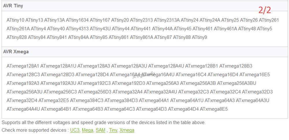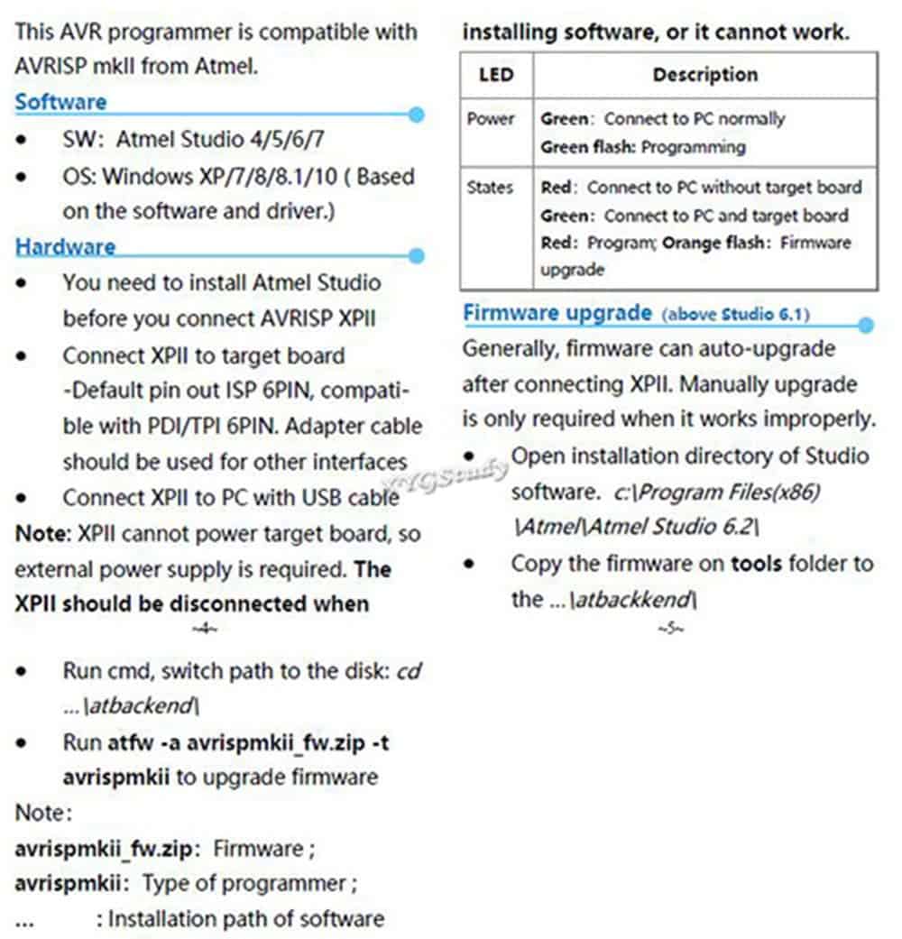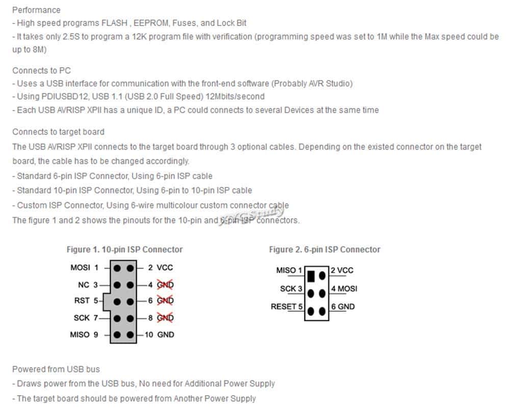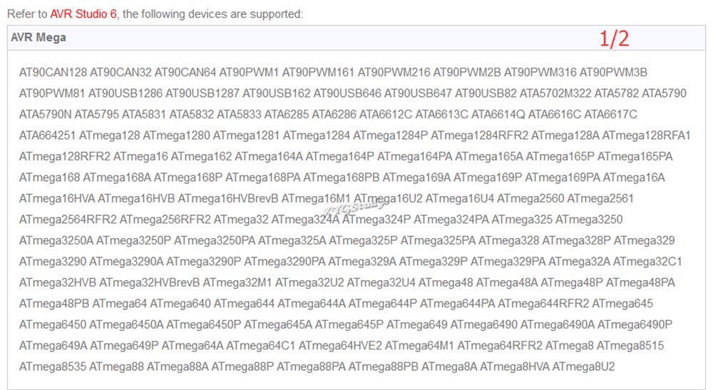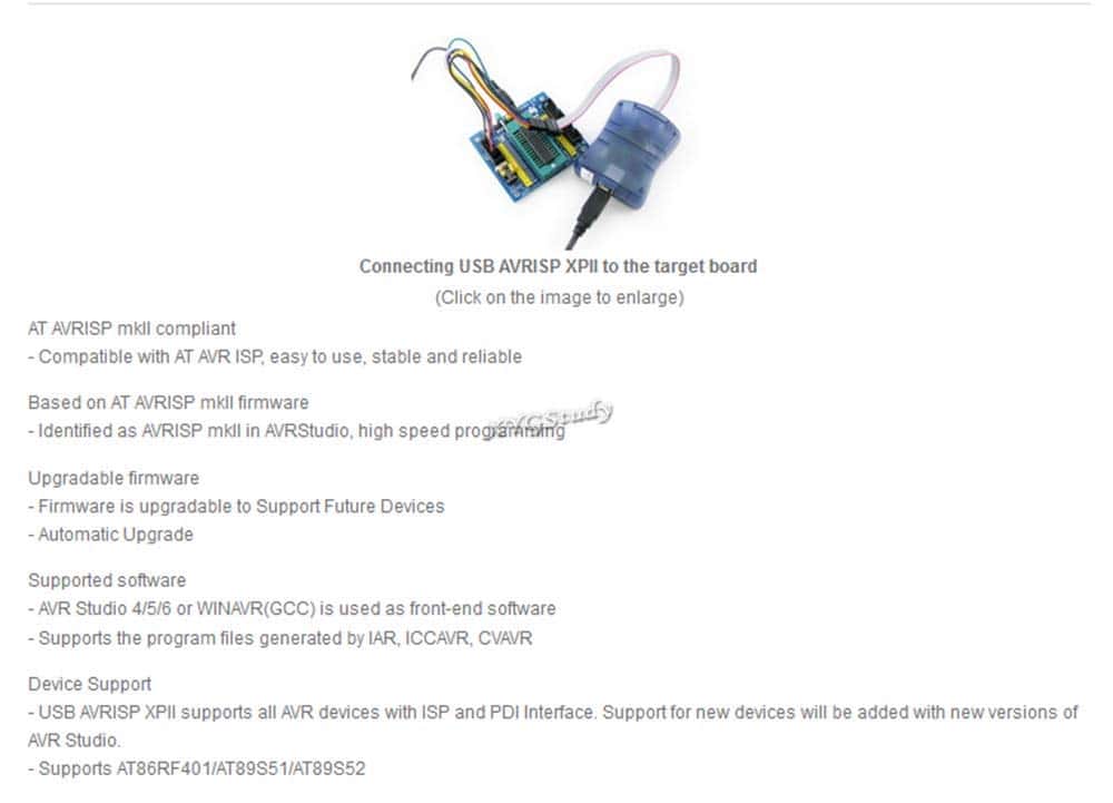 Part Number: USB AVRISP XPII. Compatible with: AT AVRISP mkII from ATMEL. Supports: all AVR devices with ISP or PDI interface, including XMEGA. Supports AVR Studio 4/5/6 or higher version (delivered with firmware for AVR Studio 5, can be updated to support other AVR Studio versions)