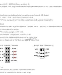 Programador AVR ISP, compatible con AT AVRISP mkII de ATMEL. Un programador profesional In-System. Compatible con todos los dispositivos AVR con interfaz ISP o PDI, incluido XMEGA. Admite AVR Studio 4/5/6 o una versión superior (entregado con firmware para AVR Studio 5, se puede actualizar para admitir otras versiones de AVR Studio). Características: Admite todos los dispositivos AVR con interfaz ISP o PDI, y ciertos dispositivos 51. Programa tanto flash como EEPROM. Admite la programación de fusibles y bits de bloqueo. Actualizable para admitir dispositivos futuros. Admite voltajes objetivo de 1,8V a 5,5V. Velocidad de programación ISP ajustable. Cumple con USB 2.0 (velocidad completa, 12Mbps). Alimentado desde USB, no requiere fuente de alimentación externa. Protección de la interfaz de destino. Protección contra cortocircuitos. Admite todos los dispositivos AVR con interfaz ISP o PDI. Admite AVR Studio o WINAVR (GCC). Admite los archivos de programa generados por IAR, ICCAVR, CVAVR. El paquete incluye: USB AVRISP XPII, Cable USB, Cable de 16 pines (de repuesto), Cable ISP de 16 pines a 10 pines, Cable de conector personalizado multicolor de 16 cables.