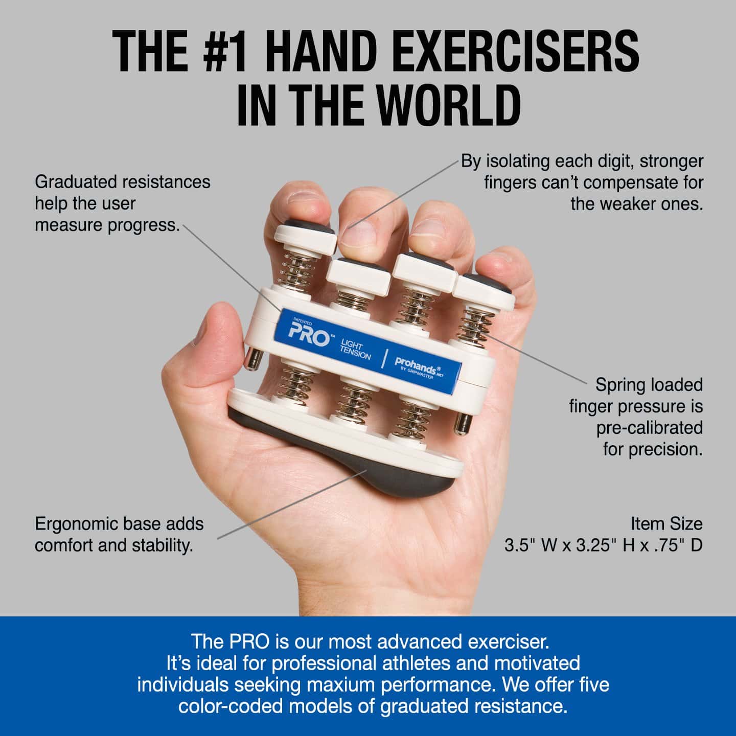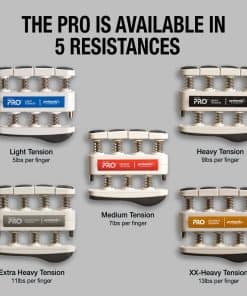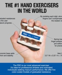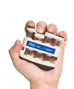 Prohands Gripmaster es el ejercitador de mano original y patentado con botones de potencia individuales. Prohands es el mejor ejercitador de mano utilizado por atletas profesionales, músicos de clase mundial y como herramienta de rehabilitación. Hecho con componentes de alta calidad como plástico ABS, muelles de acero inoxidable y santoprene. Con Prohands puedes ejercitar cada dedo de forma individual o toda la mano. Usa cada botón de forma independiente para ejercitar los dedos o comprime la unidad completa para un fortalecimiento completo de mano y antebrazo. Al aislar cada dígito, los dedos más fuertes no pueden compensar a los más débiles. Permitiendo al usuario aislar y ejercitar cada dedo de forma individual para fuerza, destreza y resistencia. Ayudando a desarrollar una extraordinaria fuerza en mano, muñeca y antebrazo. Prohands es ideal para cualquier persona que desee desarrollar y mantener manos fuertes y saludables. Puede ayudar con artritis, túnel carpiano, neuropatía y mala circulación. La familia de ejercitadores de mano Prohands viene en 4 tipos de modelos diferentes (2da imagen). VIA es nuestro modelo de nivel de entrada, GRIPMASTER es nuestro modelo característico, GRIPMASTER-Rehab es nuestro modelo característico con un cojín adicional para la palma y PRO es nuestro modelo más avanzado para profesionales e individuos motivados. Cada modelo de Prohands presenta niveles de tensión graduados que ayudan al usuario a medir el progreso. VIA 1 lb a 6 lb, GRIPMASTER 1 lb a 9 lb, GRIPMASTER-Rehab 0.75 lb a 9 lb y PRO 5 lb a 13 lb.