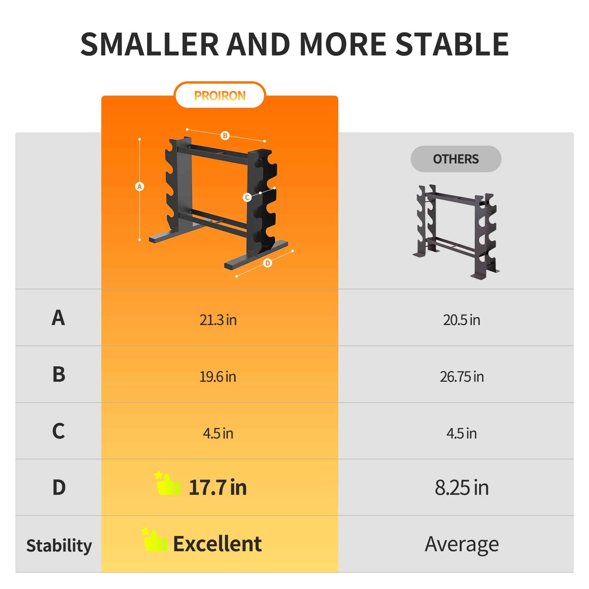 PROIRON Soporte Compacto para Rack de Mancuernas es una solución ideal para mantener tus mancuernas organizadas y al alcance fácilmente. Con un diseño ahorrador de espacio, este soporte puede almacenar hasta 20 mancuernas en solo 3.23 pies cuadrados, liberando más espacio en tu gimnasio en casa. La base de tubo de acero extra largo de 450 mm ofrece una alta estabilidad y seguridad, con una capacidad de peso de hasta 450 lbs gracias al acero de grado comercial. El rack está recubierto con pintura de alta calidad para evitar la oxidación y corrosión, manteniendo su apariencia y durabilidad a lo largo del tiempo. En PROIRON, nos preocupamos por tu satisfacción y por eso ofrecemos una garantía de satisfacción al cliente de 180 días para que compres con total confianza.