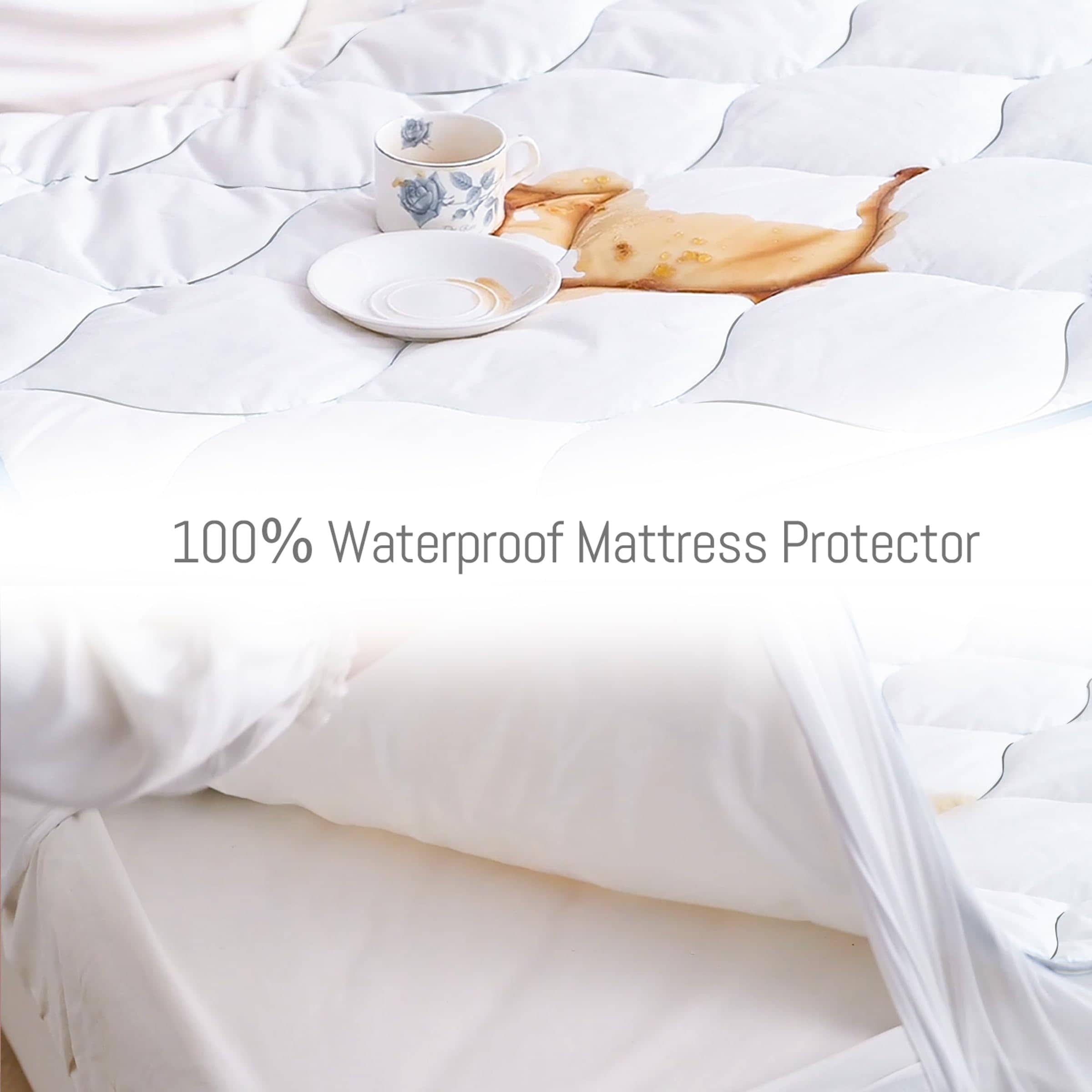 1. 100% IMPERMEABLE: La parte trasera del protector de colchón impermeable está hecha de TPU de alta calidad, que actúa como una barrera impermeable invisible para proteger su costoso colchón de la orina, transpiración y otras manchas. ¡Y nuestra funda de colchón es lavable a máquina, para que su colchón esté siempre seco y sin manchas, extendiendo aún más la vida útil de su colchón!