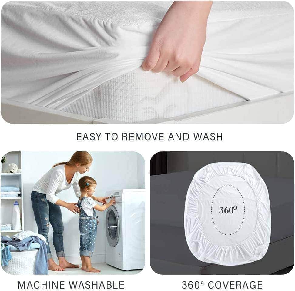 3. 100% IMPERMEABLE Y SILENCIOSO: Hay una capa de revestimiento en la parte trasera, suave, flexible y silenciosa, protegerá su colchón de todo tipo de líquidos como sudores, babas y otras manchas. Y es silencioso, sin sonido de crujido, por lo que no tendrá que preocuparse por escuchar ruidos mientras duerme.