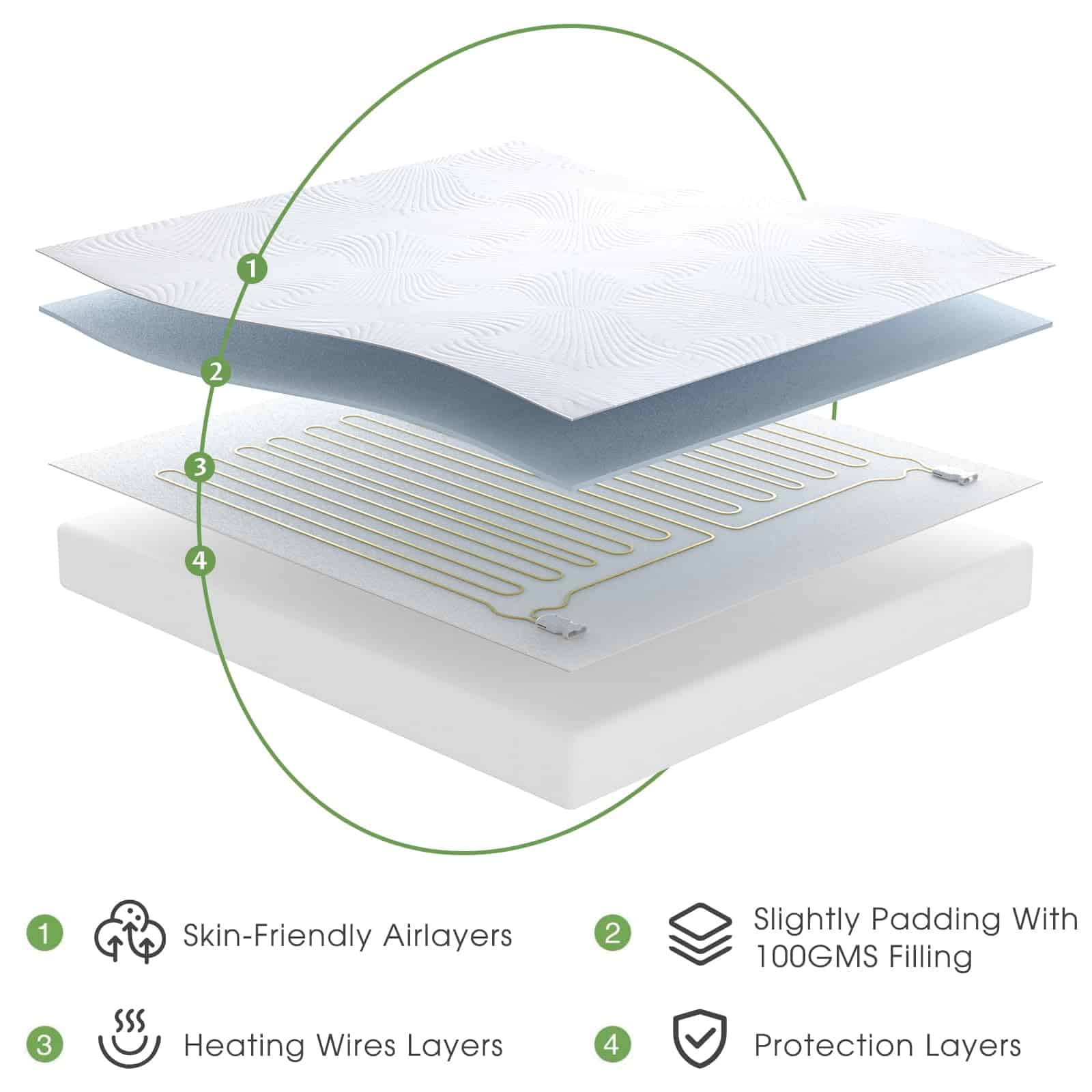 2. Nivel de calidez personalizable El protector de colchón térmico cuenta con 10 niveles de calor, lo que te permite personalizar el nivel de calidez según tus preferencias. El rango de temperatura para estos 10 niveles de calefacción es entre 87 F y 115 F, garantizando la comodidad personalizada durante toda la noche.