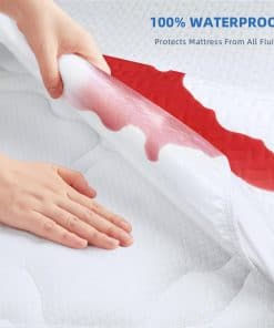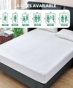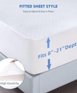 4. AJUSTE PERFECTO PARA COLCHONES DE 8″ a 21″ DE ALTURA Y SILENCIOSO – Nuestro protector de colchón impermeable tiene un bolsillo elástico de 18″ y se coloca como una sábana ajustable con una banda elástica resistente que sujeta firmemente tu colchón, para que no tengas que preocuparte por que se mueva en la cama. Además, garantizamos que nuestra almohadilla no emitirá ningún ruido cuando te des la vuelta durante la noche.
