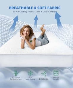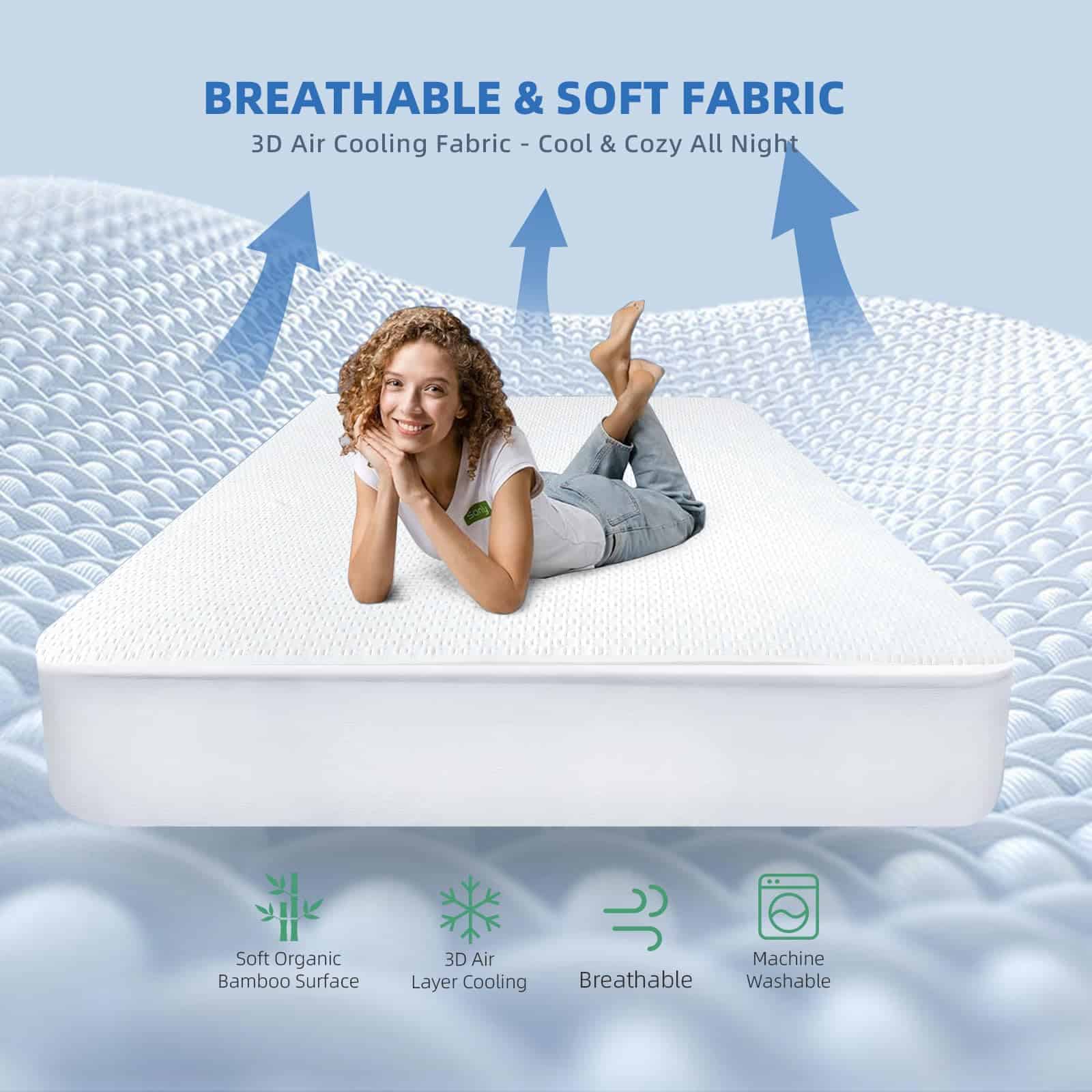 3. SUAVE Y TRANSPIRABLE – Este protector de colchón está compuesto por 60% poliéster + 40% viscosa de bambú. Esta funda de colchón te brinda una comodidad ultra suave y fresca y es excelente para absorber el sudor y los olores. Con su avanzado diseño de malla de aire 3D y membrana transpirable, el protector de colchón RestGuard permite que el aire salga y fluya a través de los miles de agujeros en la superficie para eliminar el calor sin ningún problema.
