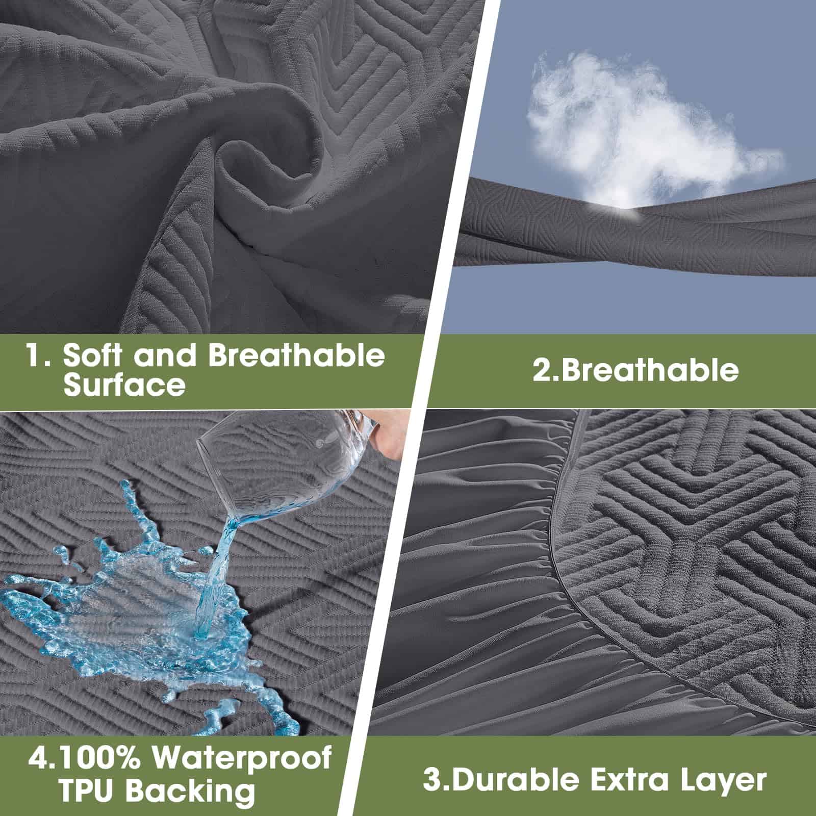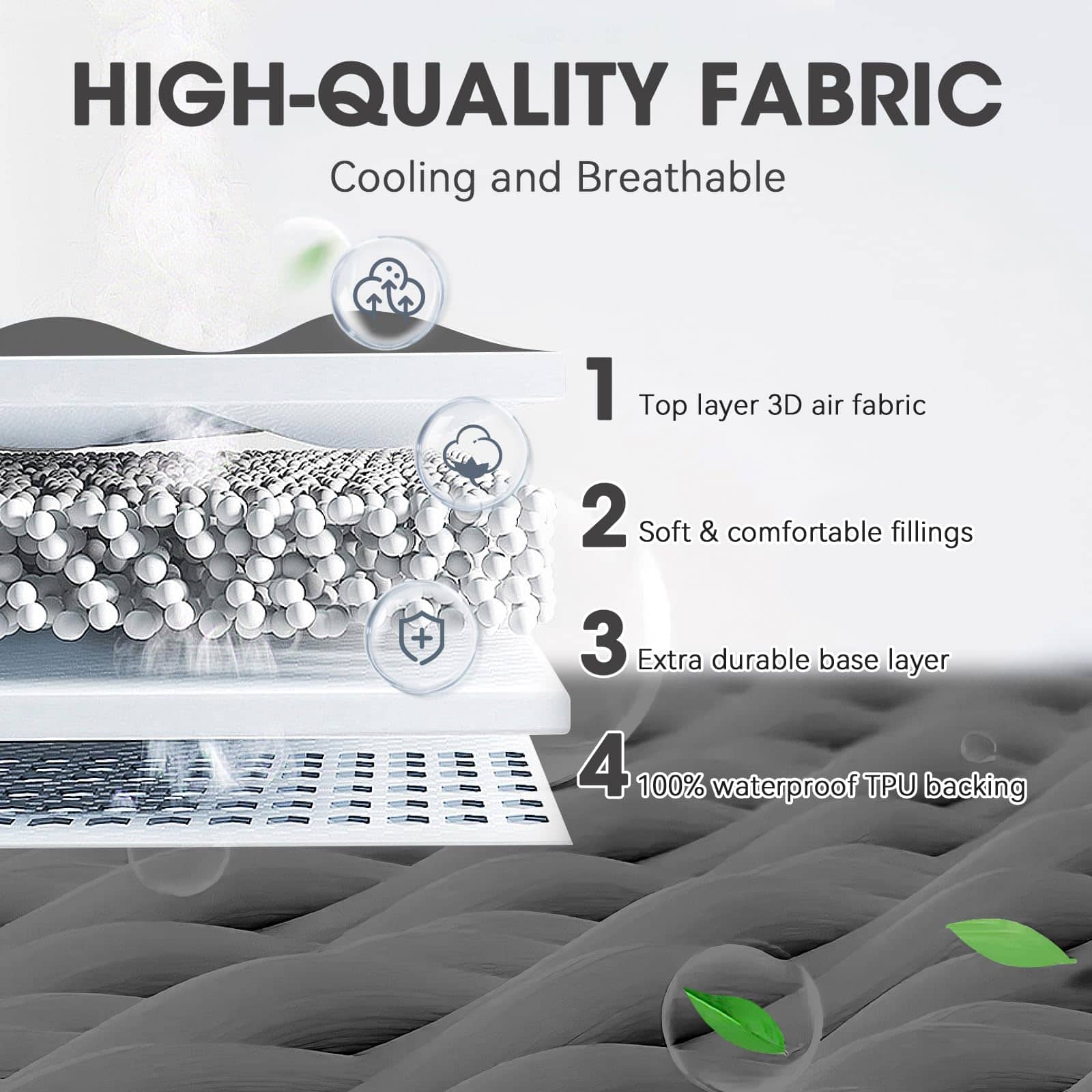 3. Tela de aire 3D: Nuestra cubierta de colchón está hecha de tela de aire 3D, que es más transpirable y más suave que otros materiales, el protector de colchón le proporciona un entorno de sueño seco y confortable, disfrute de una noche cómoda con nuestro protector de colchón.