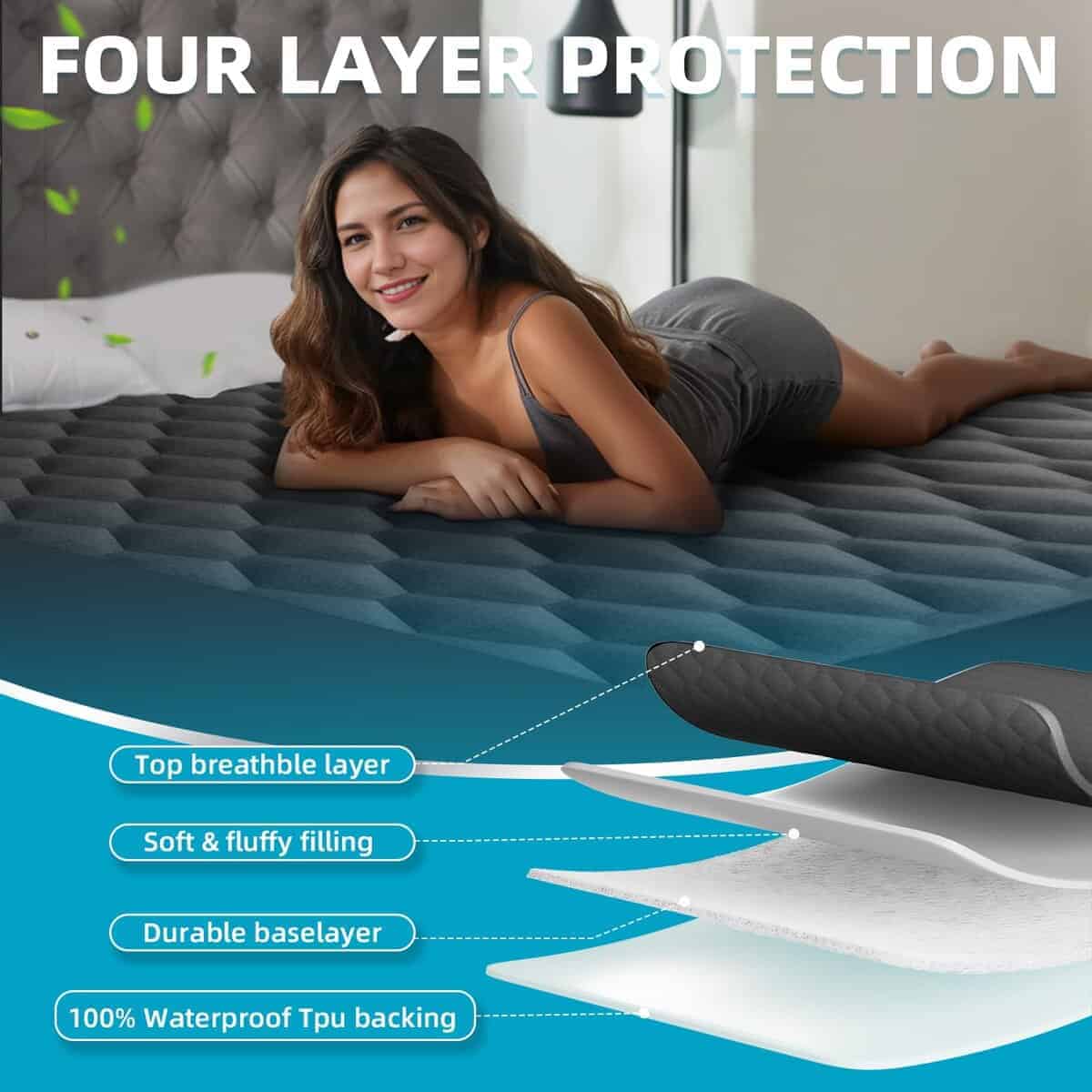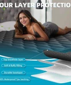 El Protector de colchón king impermeable de Kmall ofrece una protección superior contra líquidos, manchas, sudor y derrames manteniendo su colchón fresco e impecable. Con un diseño de 4 capas de relleno grueso y microfibra, este protector de colchón es suave y transpirable para un confort óptimo. La innovadora membrana doble de TPU asegura una impermeabilización eficaz sin sacrificar la suavidad o la circulación de aire.