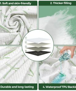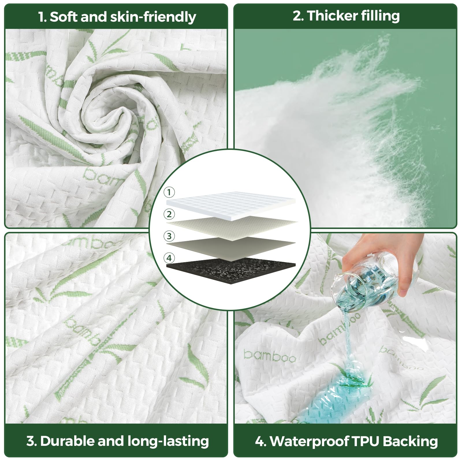 1. Tejido de Bambú: El protector de colchón de bambú es una tela súper suave y amigable con la piel. La capa superior de tela de la cubierta de colchón de bambú y el acolchado ergonómicamente diseñado proporcionan un tacto suave y ofrecen una comodidad superior.