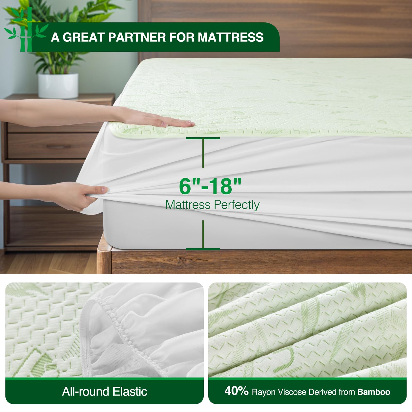 2. MATERIAL ULTRA SUAVE Y TRANSPIRABLE: La superficie de nuestro protector de colchón está hecha con un 40% de viscosa premium derivada de bambú, ofreciendo un tacto suave, sedoso y suave con una excepcional transpirabilidad. En comparación con los protectores impermeables ordinarios, nuestro diseño 3D Air mejora el flujo de aire en casi un 200%, distribuyendo eficazmente el calor, absorbiendo la humedad y manteniéndolo fresco y seco durante toda la noche.