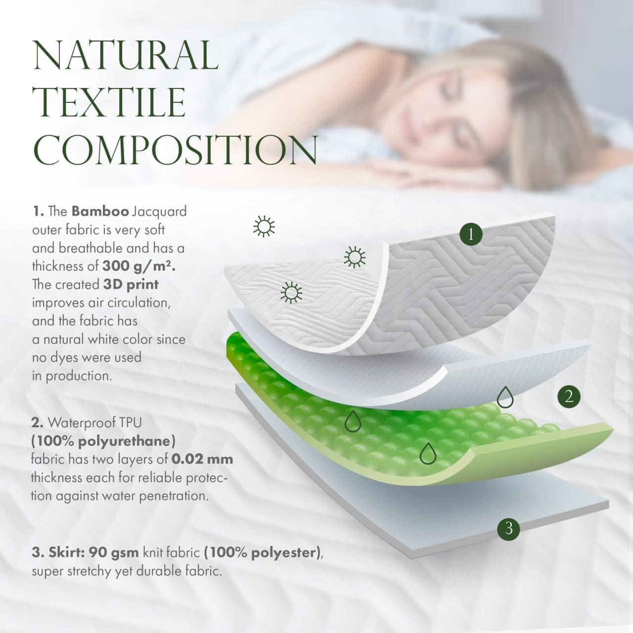 1. PROTECCIÓN IMPERMEABLE MEJORADA: Cuenta con una capa impermeable TPU actualizada de 1+1, asegurando que su colchón se mantenga seco y en perfecto estado a través de derrames y accidentes.