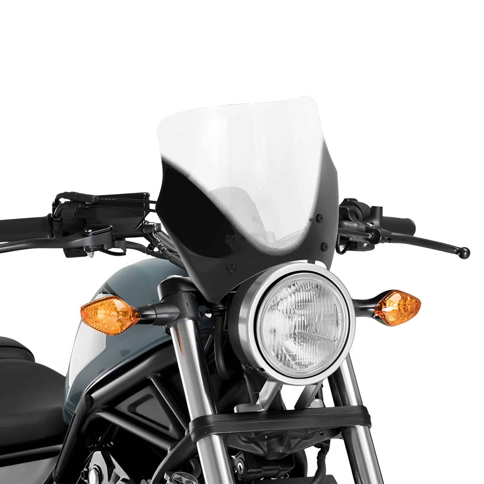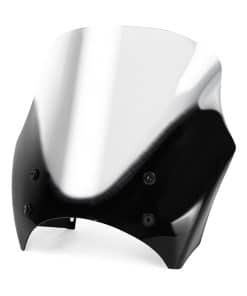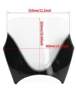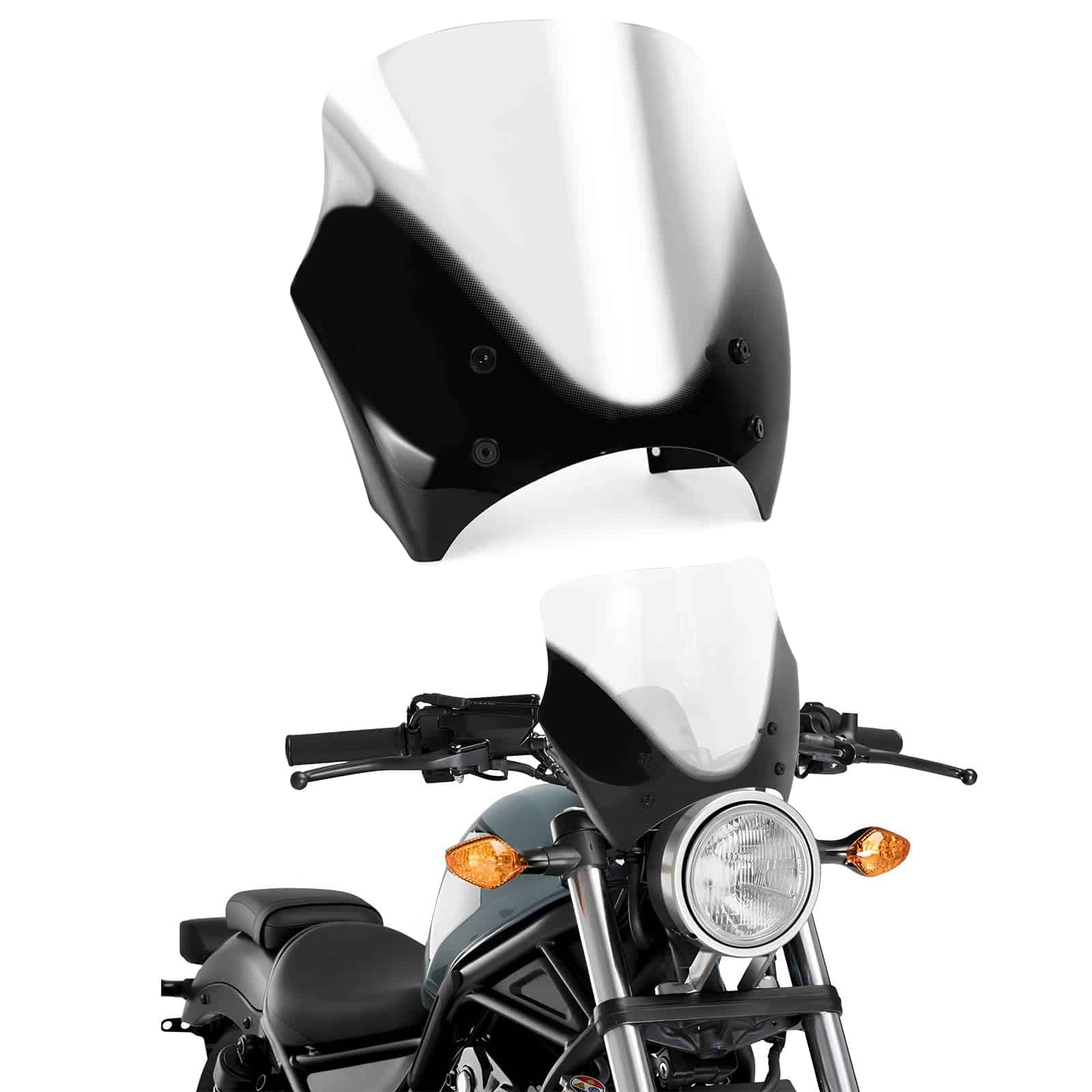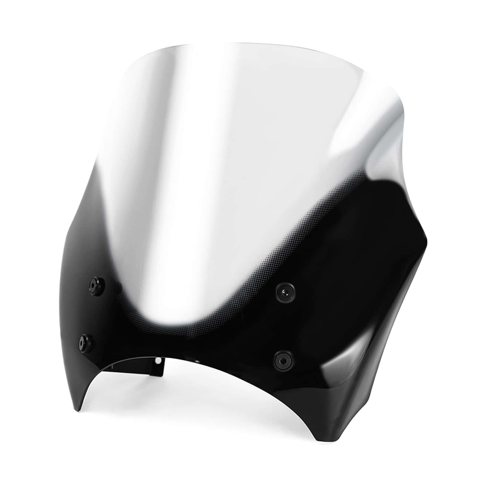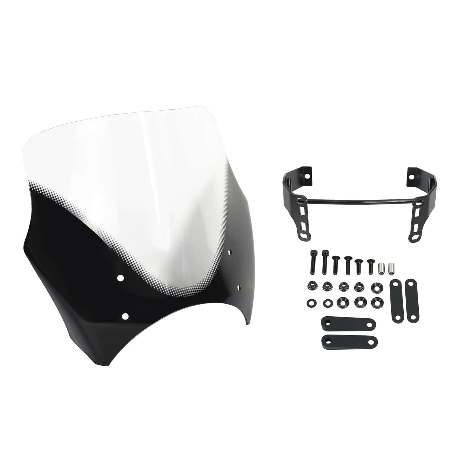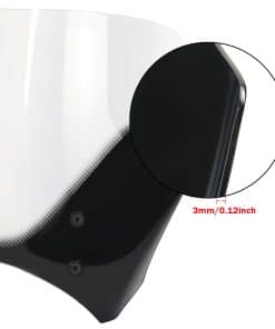 2. Material: Sección del parabrisas: Plástico ABS (3mm); Sección del soporte: Acero, pintura negra; Disponible en Negro/Transparente/Ahumado Claro.