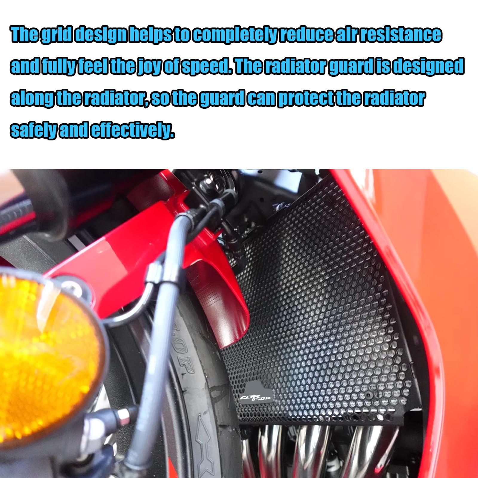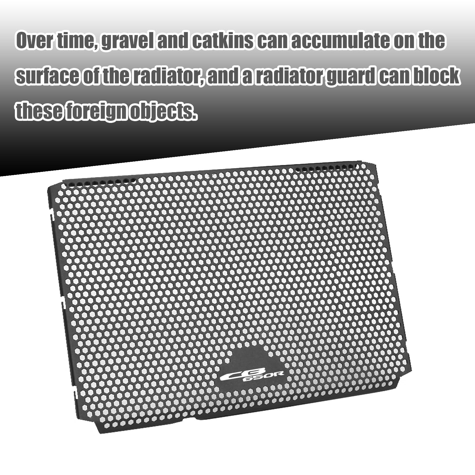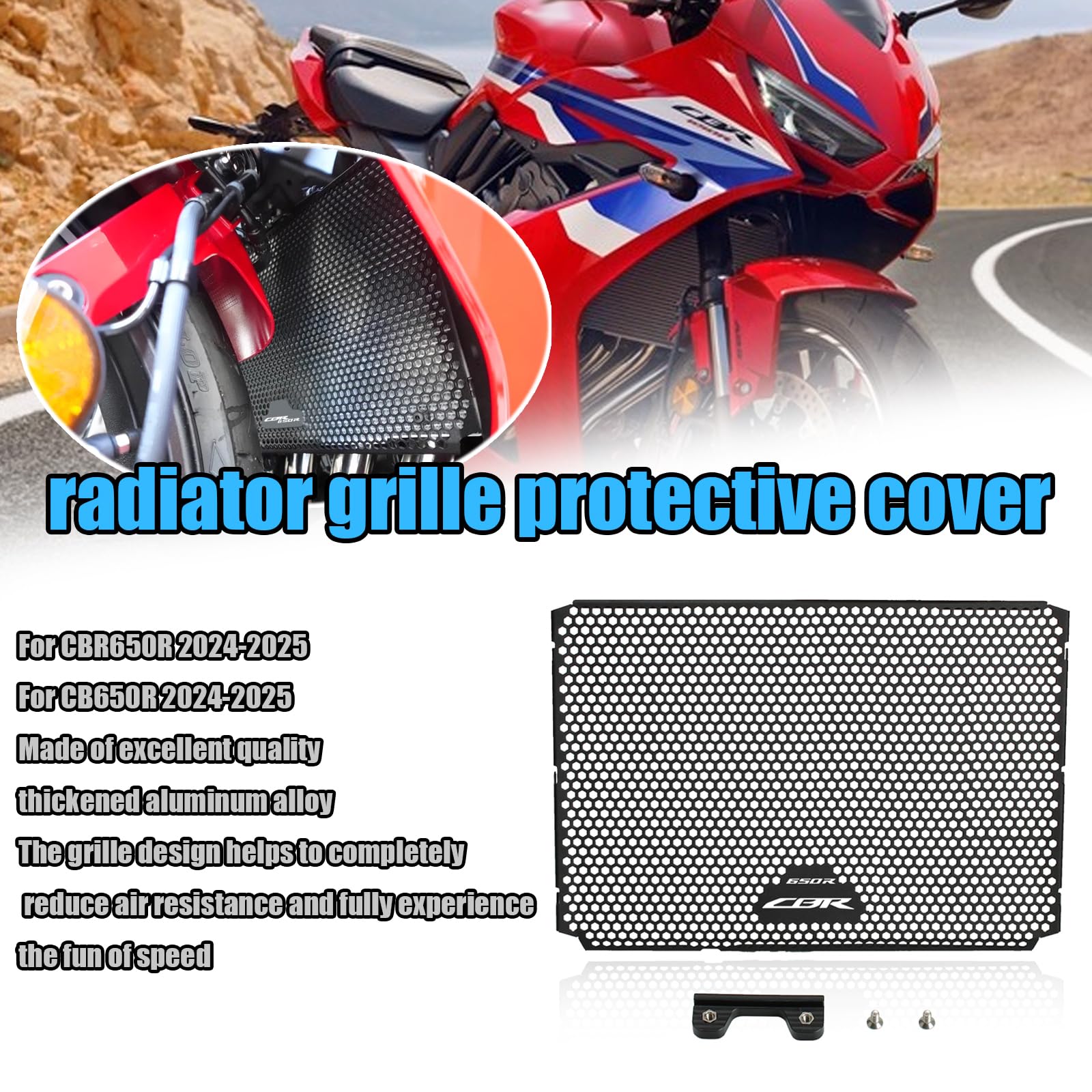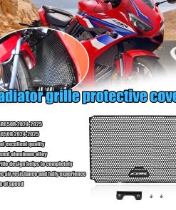 Protector de Radiador de Aleación de Aluminio. Este protector de rejilla de radiador está diseñado para proporcionar una decoración sólida para el radiador, fabricado en aleación de aluminio de alta calidad para una mayor durabilidad. La rejilla ayuda a reducir la resistencia del aire y disfrutar plenamente de la velocidad. Además, protege el radiador de la acumulación de suciedad y restos del camino. Ideal para CBR650R y CB650R 2024-2025. Asegúrate de que esta pieza se ajuste a tu motocicleta antes de comprar.