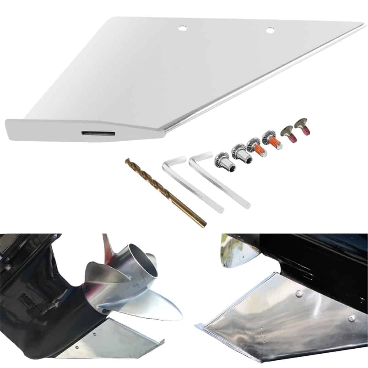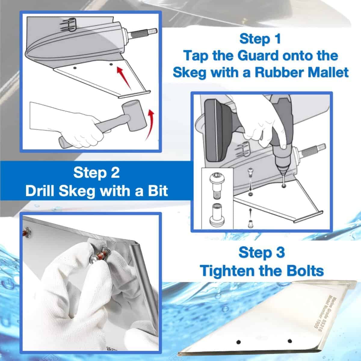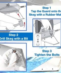 5. Fácil Instalación. Deje 2-3 pulgadas de skeg en primer lugar. Use un mazo de goma, deslice el Guarda sobre el skeg existente y golpee suavemente hasta que esté completamente asentado. Luego use los agujeros pre-perforados del guardabarros para taladrar el skeg con una broca de 1/4 de pulgada suministrada con el producto, apriete los herrajes con la llave hexagonal