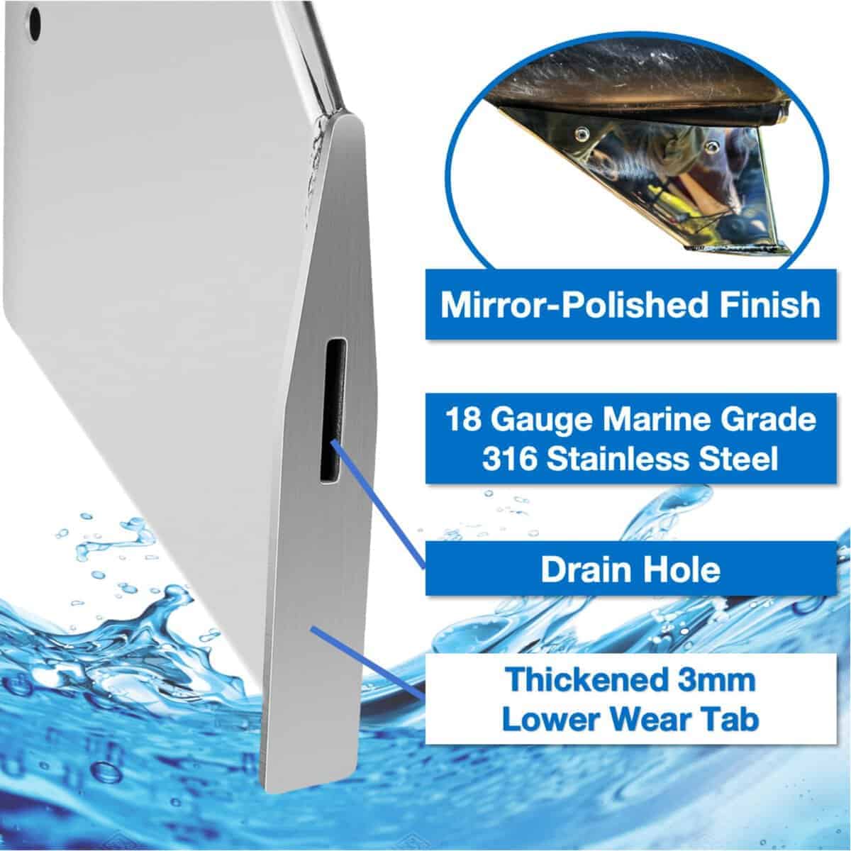 4. Ingeniería Racional y Considerada. La pestaña inferior de desgaste de 3 mm engrosada reduce el arrastre en la rampa. El protector también cuenta con un agujero de drenaje en la parte inferior para evitar que el agua se acumule y cause corrosión o congelación.