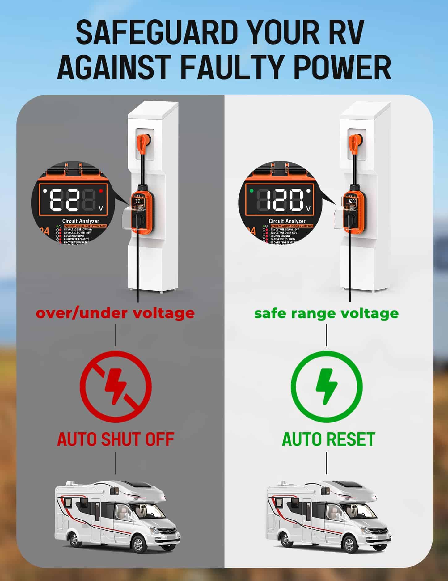 Con una clasificación robusta de 10,000J, el protector de sobretensión de 30 Amp para RV Docusvect ofrece una defensa altamente efectiva contra las sobretensiones. En caso de picos que excedan su capacidad de absorción, el protector de sobretensión auto se apaga, brindando una protección confiable para su RV y evitando daños en sí mismo. Nuestro protector de sobretensión de 30 Amp para RV ofrece protección inteligente al apagar automáticamente la energía cuando detecta problemas con la energía. Una vez que el circuito se estabiliza a la normalidad, se restablece automáticamente la energía, lo que le permite probar convenientemente los electrodomésticos en busca de posibles sobrecargas. No solo detecta fallas comunes en el cableado como tierra abierta o polaridad inversa, sino que también incluye monitoreo de voltaje y temperatura para prevenir daños por voltajes bajos o altos en sus electrodomésticos y proteger contra sobrecargas en el circuito. Equipado con una pantalla LED, el protector de sobretensión de energía para RV de 30 Amp proporciona lecturas de voltaje en tiempo… (truncated)