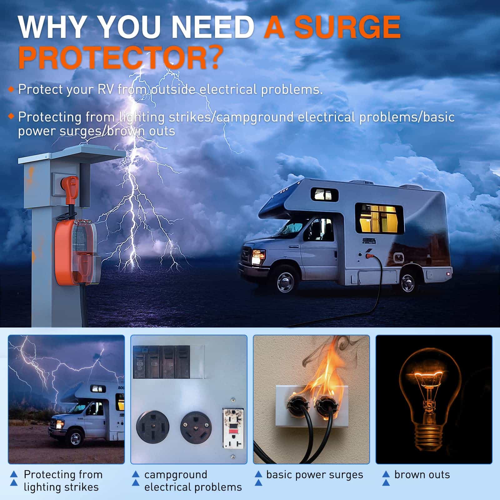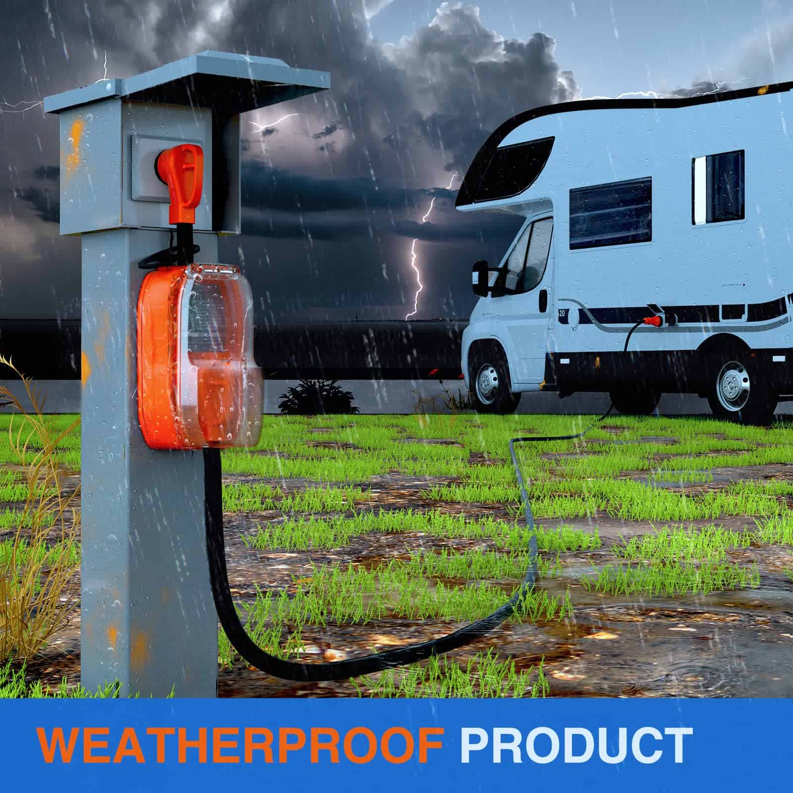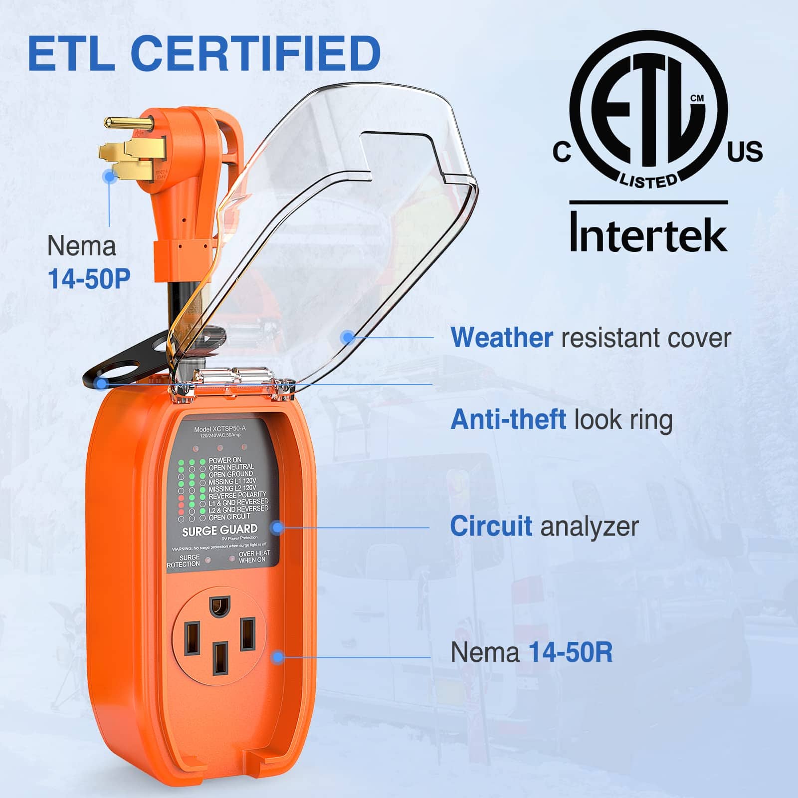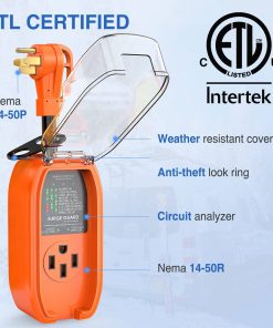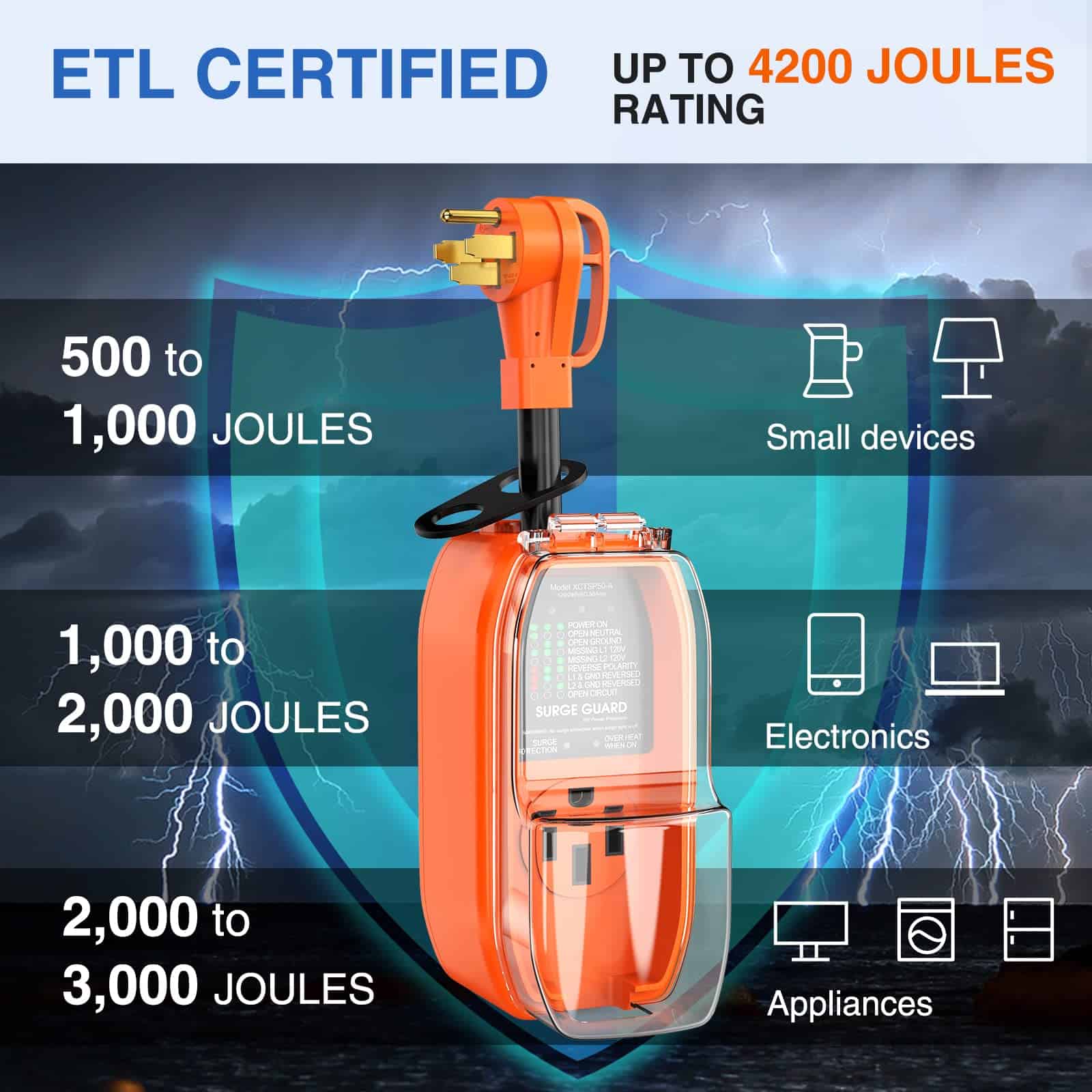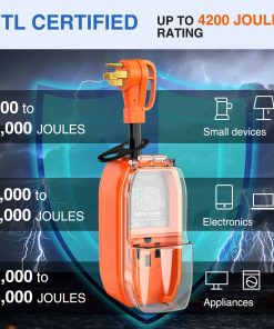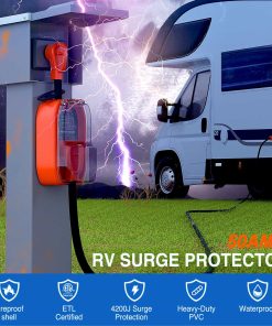 1. Protector de sobretensión para RV de 50 amperios con conexiones NEMA 14-50P y NEMA 14-50R, calificado para 125 voltios, 6250 vatios. Puede identificar la energía defectuosa del parque RV, dar a su equipo 4200 julios del protector de sobretensión. Protege su RV de niveles de voltaje peligrosamente altos o bajos y de sobretensiones, manteniendo su RV seguro y protegiendo su sistema de energía RV.