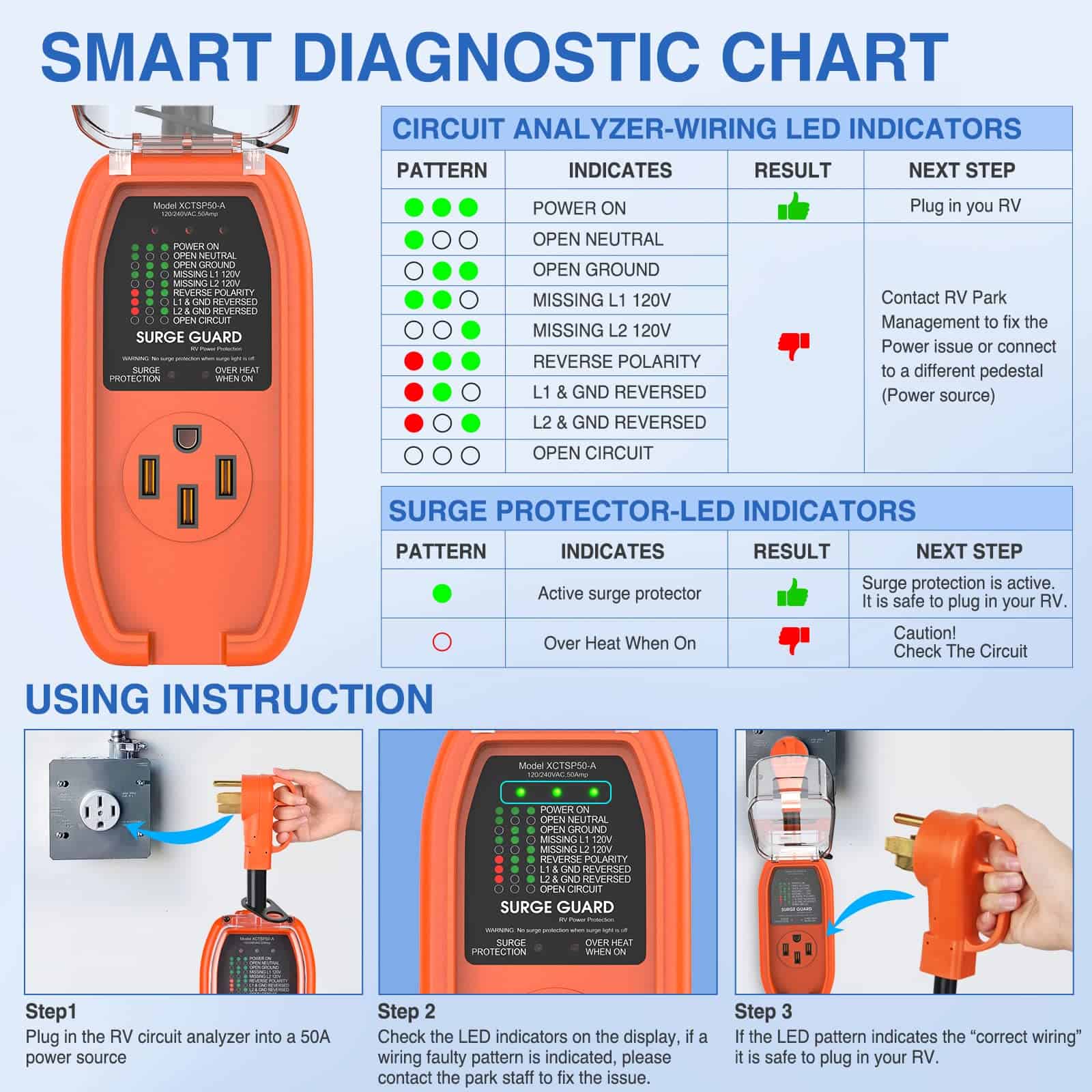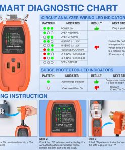 4. Instalación fácil: El producto está diseñado para enchufar y usar. Una serie de LED de diagnóstico indican el estado del circuito fuente. Conecte el analizador de circuitos RV a una fuente de alimentación de 50 amperios y verifique los indicadores LED en la pantalla. Si se indica un patrón de cableado defectuoso, comuníquese con el personal del parque para solucionar el problema. Si el patrón LED indica el Encendido de Energía, es seguro enchufar su RV.