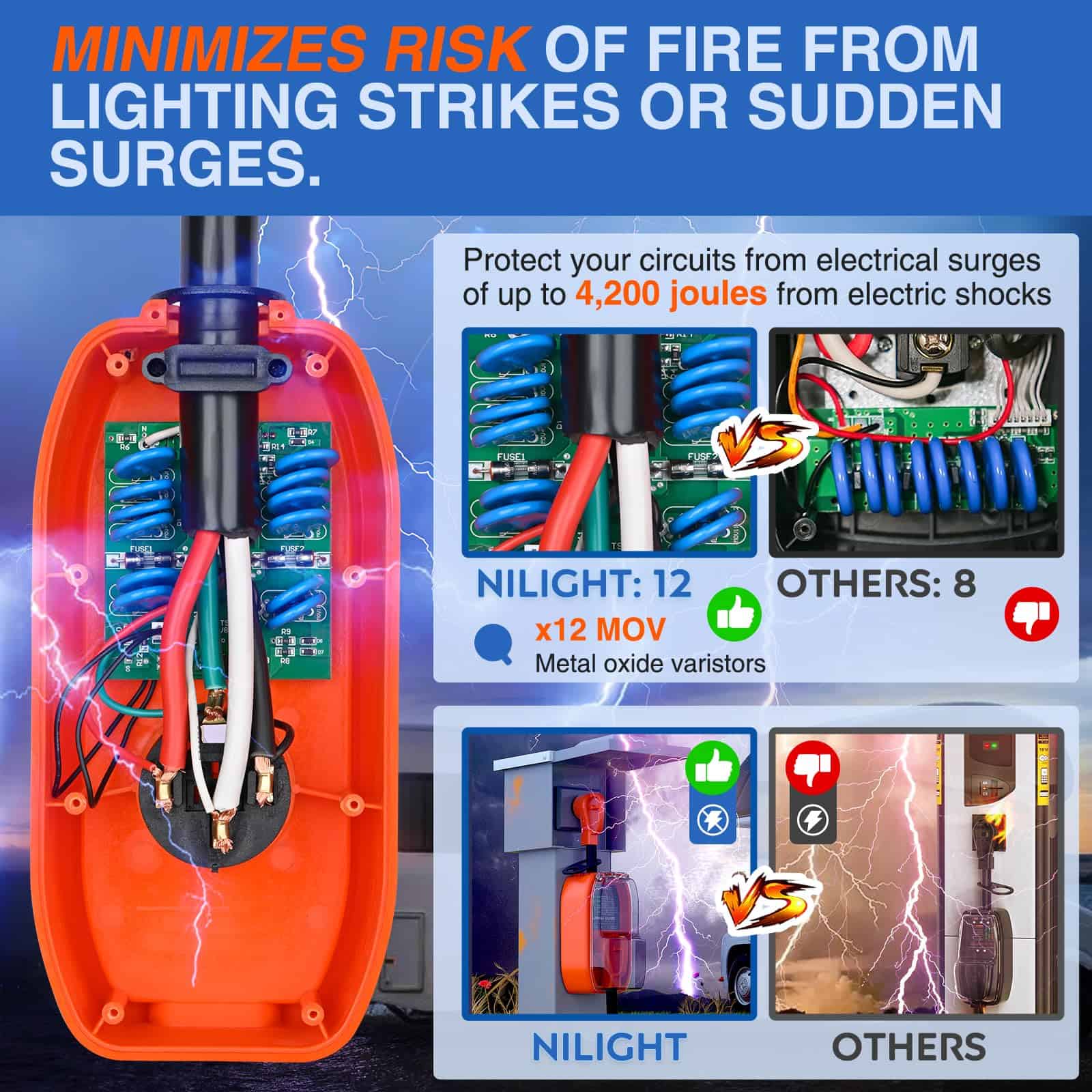 2. Alto rendimiento: hay 12 MOV en la placa de circuito interna, minimiza en gran medida el riesgo de incendio por rayos o sobretensiones repentinas. Construido con 100% de cobre puro con cables de 3 x 6 de calibre completo y 1 de 8 de calibre, garantizando alta conductividad. El cordón está recubierto con una funda de PVC resistente al fuego y resistente al calor. Viene con una cubierta resistente a la intemperie para uso en exteriores, que protege el circuito de la lluvia, el viento y otras condiciones difíciles.