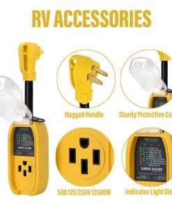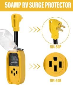 Protector de Sobretensión para RV S7 de 50 Amperios Impermeable, 12000 Julios RV Power Surge Guard para RV Adaptador Plug for Camper Este protector de sobretensión proporciona un nivel de protección de 12,000 Julios, 125V/250V, que puede soportar más equipos electrónicos y electrodomésticos de alta potencia, proporcionando protección y seguridad de puesta a tierra para los sistemas eléctricos. Cuando este protector de sobretensión de 50 amperios para RV está conectado a la fuente de alimentación, el indicador LED tiene un total de 7 modos (conexión correcta, tierra abierta, polaridad inversa, fase abierta, neutro abierto, tierra caliente invertida, caliente en neutro con caliente abierto), mostrando diferentes condiciones de iluminación. Esto verifica que la fuente de alimentación esté cableada correctamente y ayuda a detectar la mayoría de las fallas de cableado. Este protector de sobretensión de 50 amperios para RV ha sido actualizado con una cubierta impermeable más grande, adecuada para enchufes de mayor tamaño, protegiendo el circuito de la lluvia, el viento, las tormentas de arena. El protector de sobretensión para RV de 50 amperios está equipado con materiales retardantes de llama y un diseño impermeable IP68. Puede proteger los circuitos de condiciones climáticas extremas como la lluvia, el viento, las tormentas de arena, etc. Este protector de sobretensión certificado de seguridad y ecológico es extremadamente seguro y confiable, lo que puede evitar daños a su equipo eléctrico para RV.