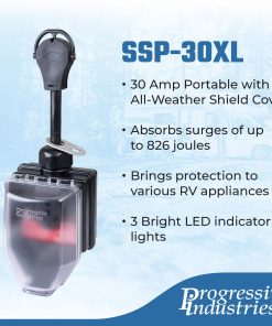 Protector de sobretensión para RV de Progressive Industries, 30 Amperios, Portátil con Cubierta, SSP-30XL. Protección contra Sobrevoltaje: 3 Modos / 825J / 22,500A. Clasificaciones: 30A / 120V / 3,600W. Temperaturas de Operación: -40C a +105C. Detección de Tierra Abierta, Neutro Abierto y Polaridad Inversa, Indicación de Pedestal Mal Conectado, Indicador de Falla de Sobretensión. Diseñado para Uso en Exteriores, Resistente a las Inclemencias del Tiempo, Ensamblaje con Protector contra Todo Clima, Protegido Térmicamente. Mango Resistente, Soporte de Bloqueo, Resistente Carcasa de Lexan, Indicadores LED de 3 Colores Más Brillantes. Certificado por UL y Aprobado por Canadá, (excluye el Ensamblaje con Protector contra Todo Clima).