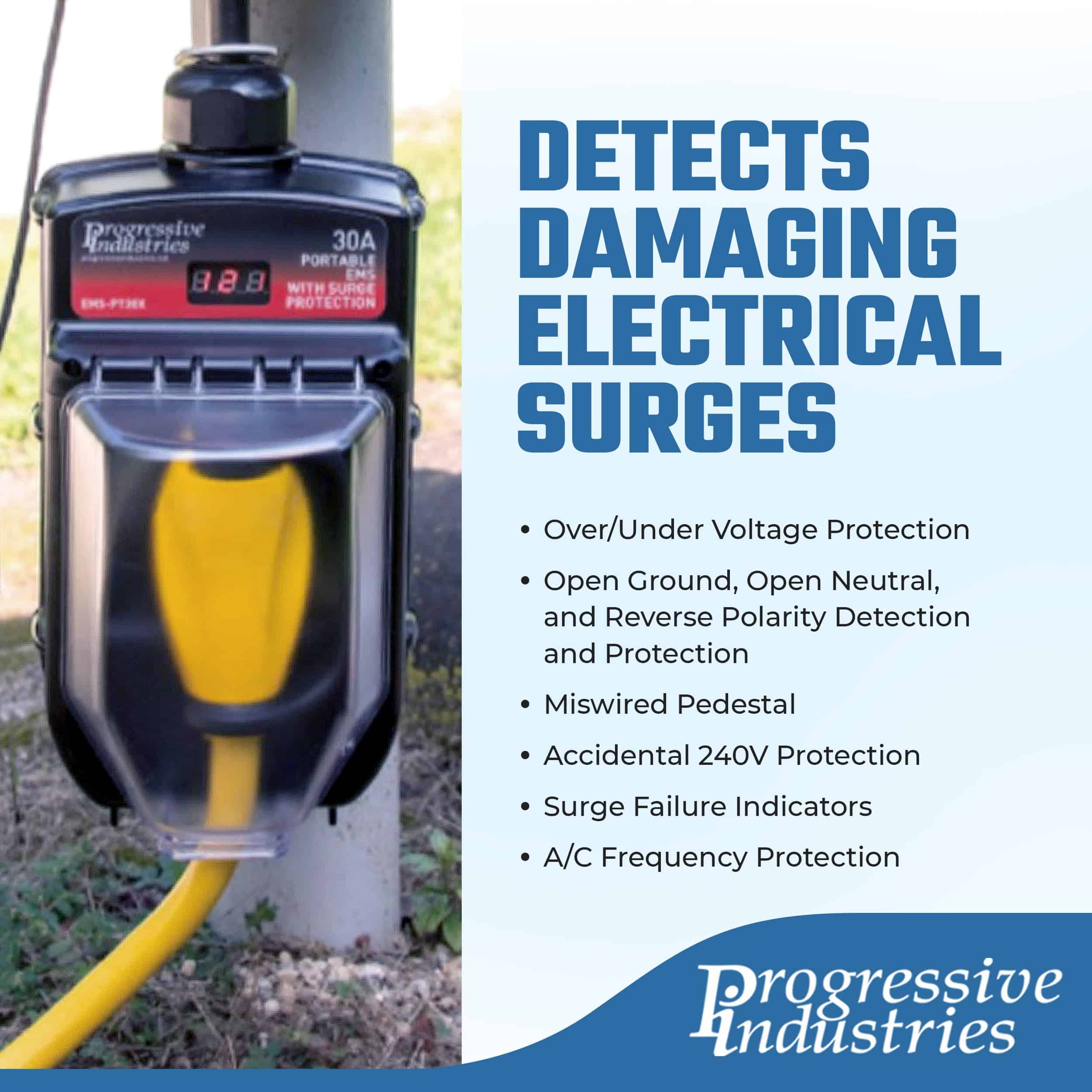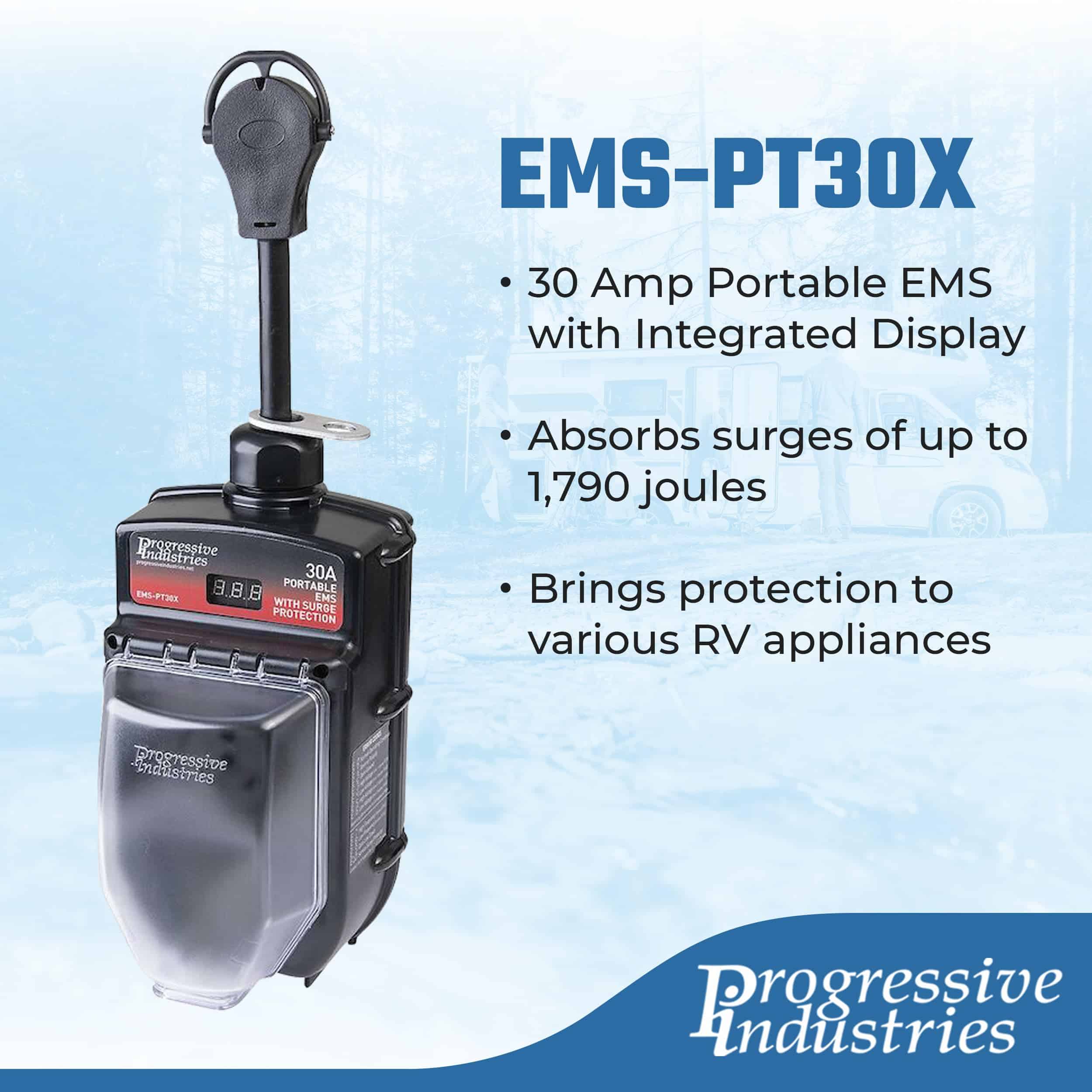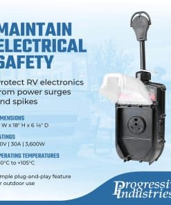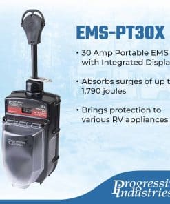 1. Mantenga la seguridad electrónica – Este Protector de Sobretensión de 30 Amp para RV de Progressive Industries es un verdadero guardián para la electrónica de su RV. Su Sistema de Gestión Eléctrica incorporado ayuda a proteger sus electrodomésticos RV contra fluctuaciones de voltaje y sobretensiones. 2. Evita daños costosos – Con una clasificación de 30A/120V/3,600W, EMS-PT30X puede absorber sobretensiones de hasta 1,790 julios. Este protector de sobretensión previene daños severos y costosos en accesorios y equipos RV conectados a su RV motorizado o remolcable. 3. Potente detección de fallas – Como protector de sobretensión de 30 amperios para RV, EMS-PT30X puede proteger contra sobre/subtensión, tierra / neutro abierto, polaridad inversa, pedestal mal cableado, 240V accidental y falla de sobretensión; así como protección de frecuencia de CA. 4. Para exteriores – Este protector de sobretensión resistente puede soportar condiciones adversas a través de su conjunto de escudo resistente a la intemperie, pantalla integrada, protección térmica y resistente carcasa de Lexan. Esta unidad también es utilizable durante situaciones de poca visibilidad. 5. Diseñado con orgullo en EE. UU. – Progressive Industries diseña y fabrica una amplia gama de soluciones eléctricas de alta calidad diseñadas para entornos adversos. Proteja hoy sus accesorios y electrodomésticos RV de daños graves y costosos.