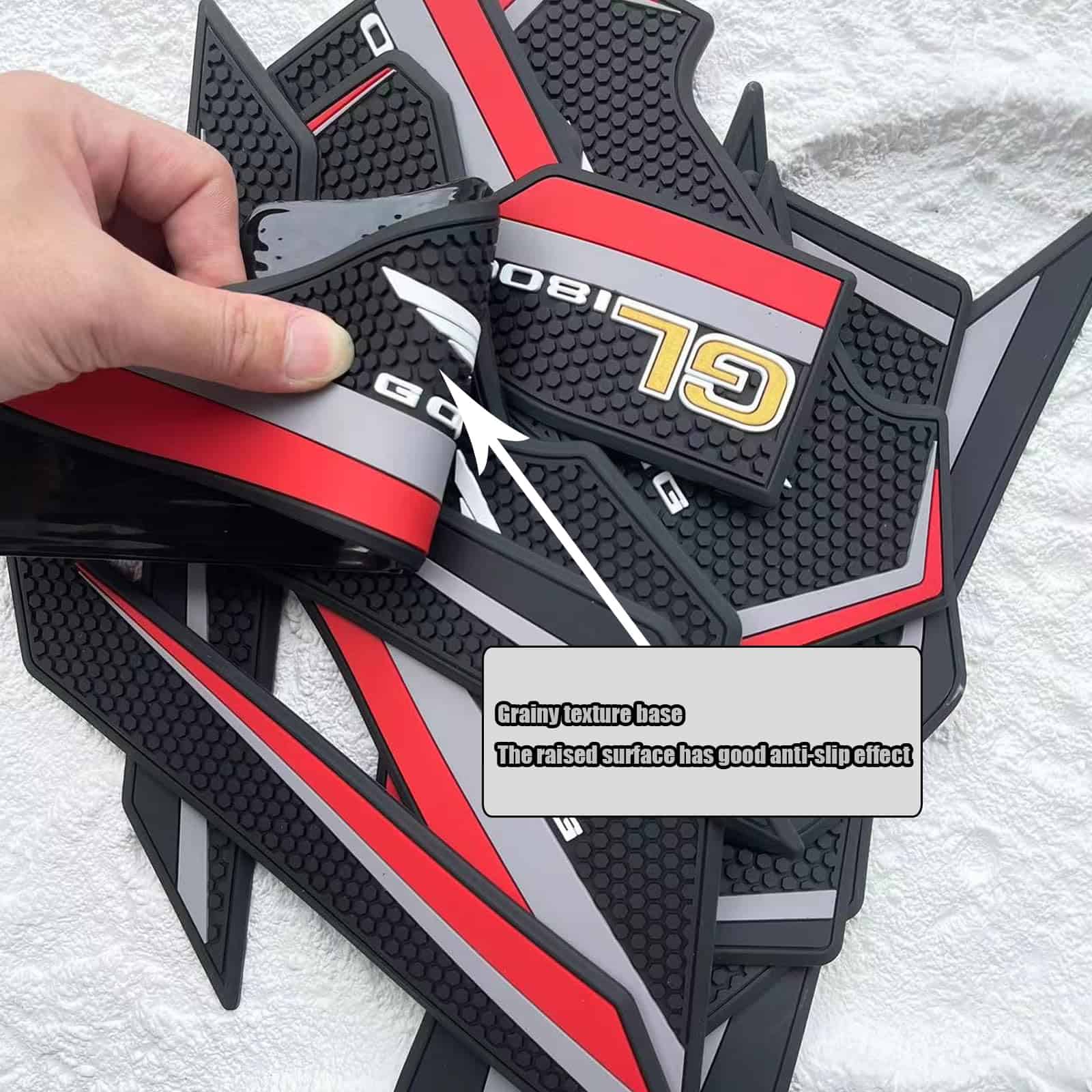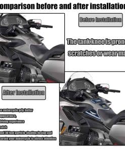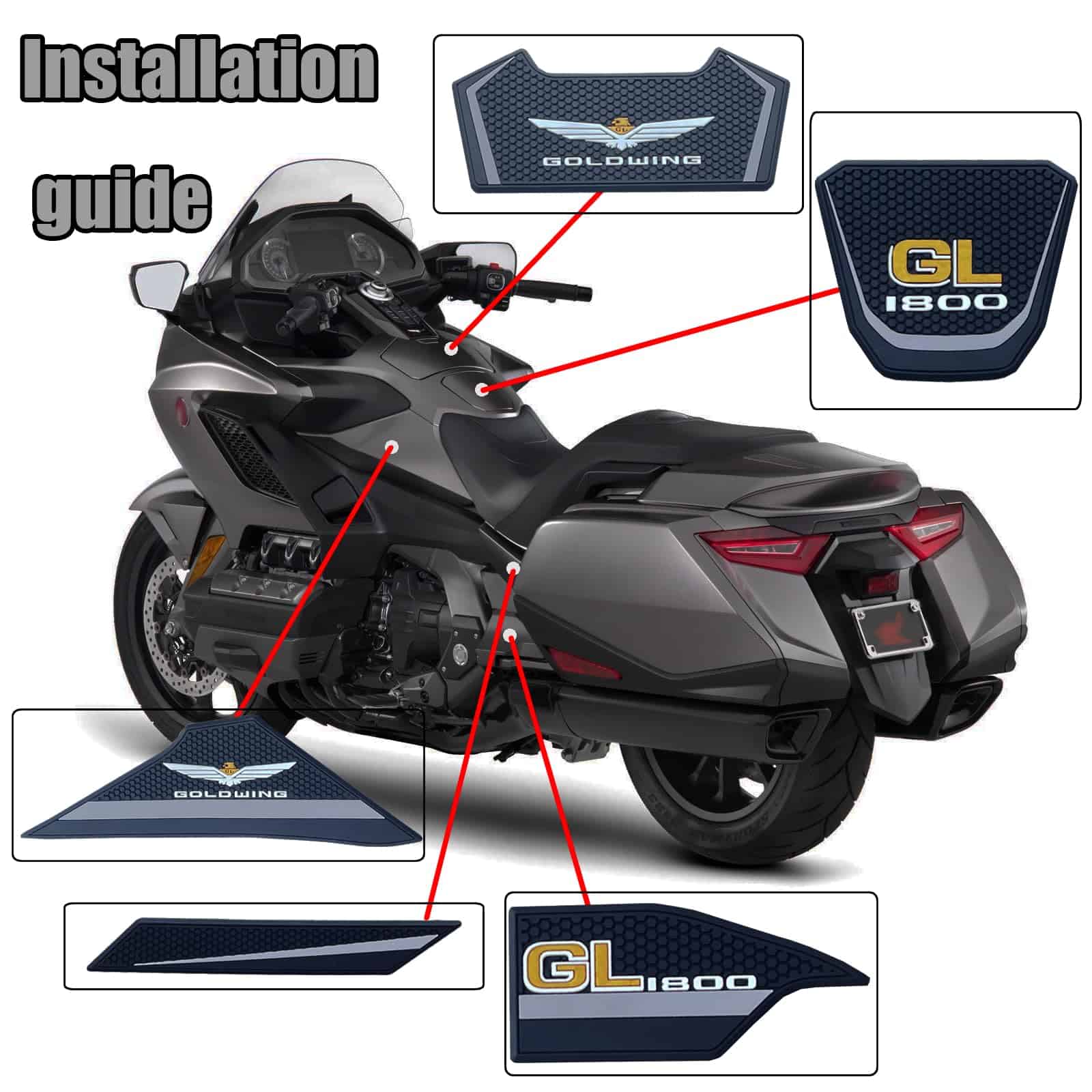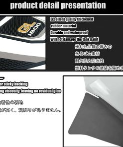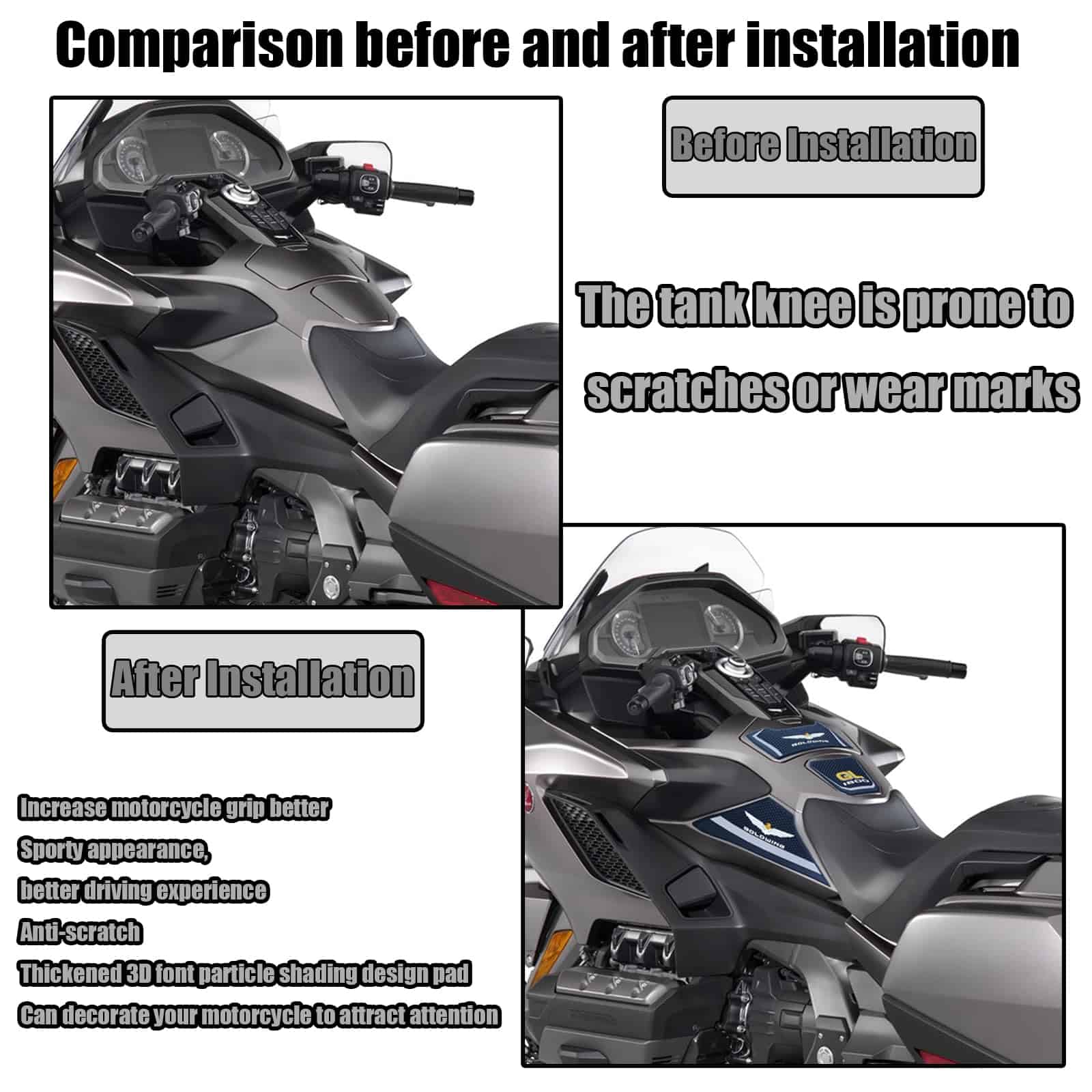 Protector de tanque de combustible lateral para motocicleta Gold Wing GL1800 F6B tipo B. Pegatina adhesiva de protección para tanque de combustible lateral de excelente calidad para Gold Wing GL1800 F6B. La textura de grano en la parte inferior es efectiva para evitar deslizamientos y las patas se adhieren firmemente al cuerpo durante frenadas de emergencia para mantener el cuerpo estable. Las letras tridimensionales incrustadas le dan un aspecto hermoso y elegante. Fácil de instalar y quitar sin dañar la pintura del tanque. Perfecto para personalizar y proteger tu motocicleta.